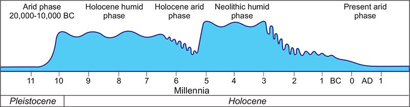 1.6 Even in comparatively small regions like the Western Sahara there were times when the effects of climate change differed from one subregion to another. The diagram shows that after 2000 BC the northern part of the Sahara remained continuously dry while the southern regions enjoyed episodes of more humid weather.