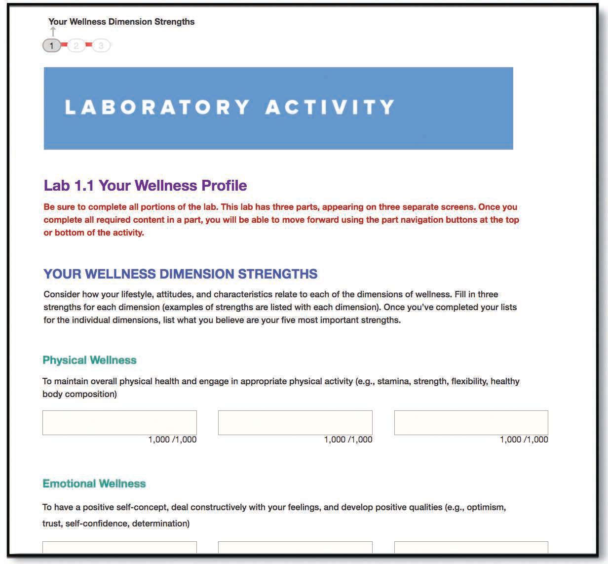 Hands-on lab activities give students the opportunity to assess their current level of fitness and wellness and to create their own individualized programs for improvement.