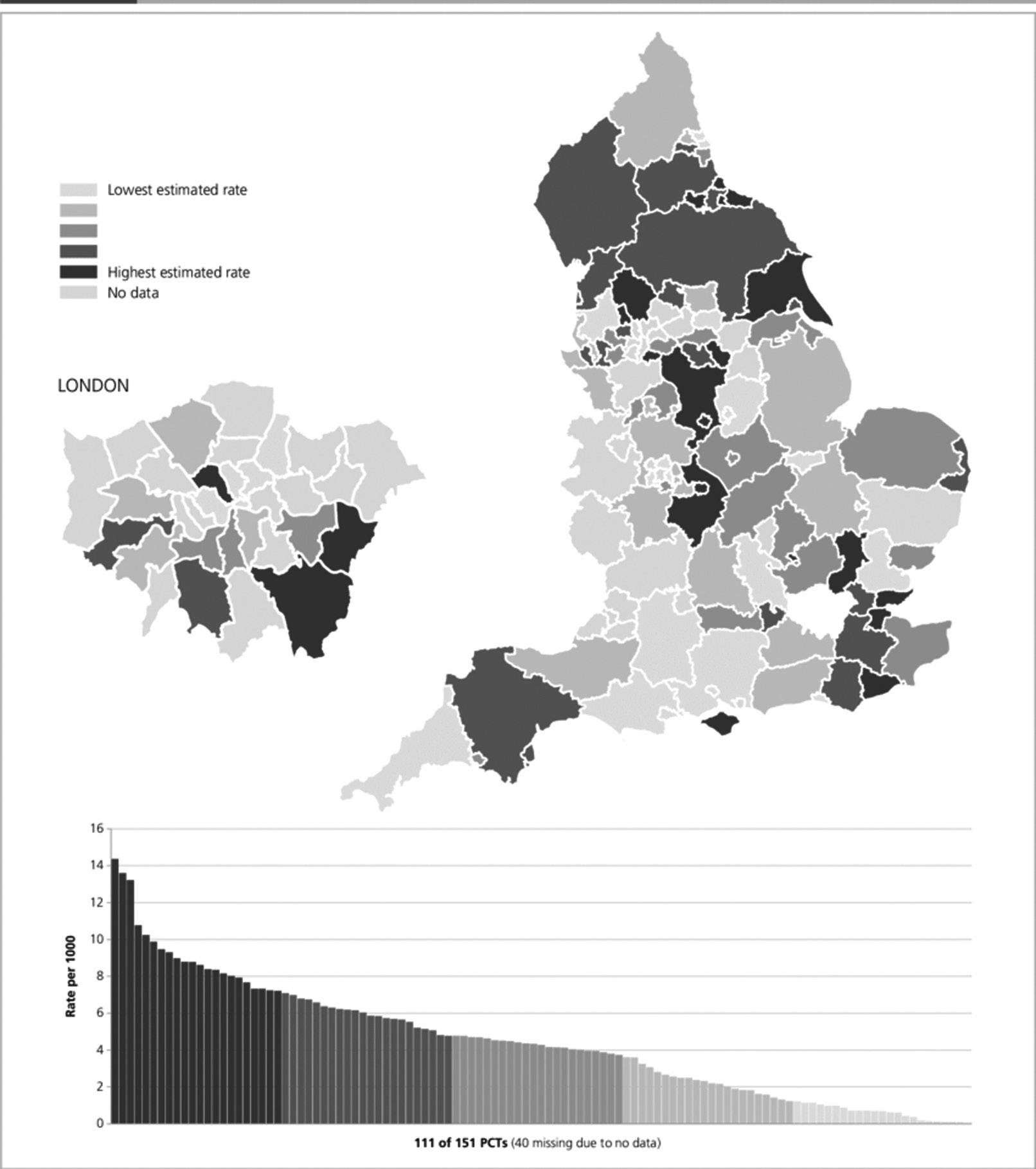 Fig. 1.1 Brain natriuretic peptide (BNP or NTproBNP) request rates across primary care organizations (primary care trusts (PCTs)) in England in 2012. From National Health Service ‘Atlas of Variation’.