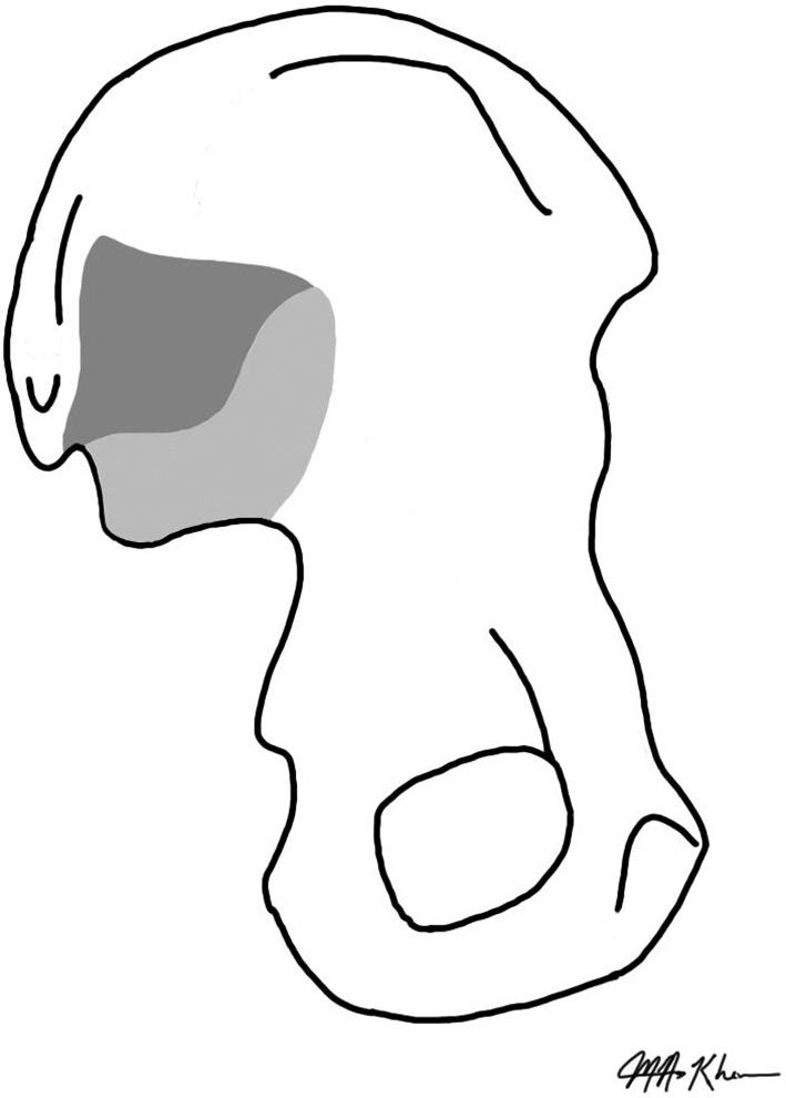 Figure 1.5 The sacroiliac joint area, as visualized from the inner side of the separated left pelvic bone, is shown in two shades of gray; the darker area depicts the ligamentous part and the lighter area (shaped like a boomerang) forms its “synovial” part. Just behind the ligamentous part is the area called the ischium (or the gluteal tuberosity) that bears our weight when we are sitting down. The front lower part of the pelvic bone is called the pubis that forms a junction (called the pubic junction or pubic symphysis) with the other pelvic bone.