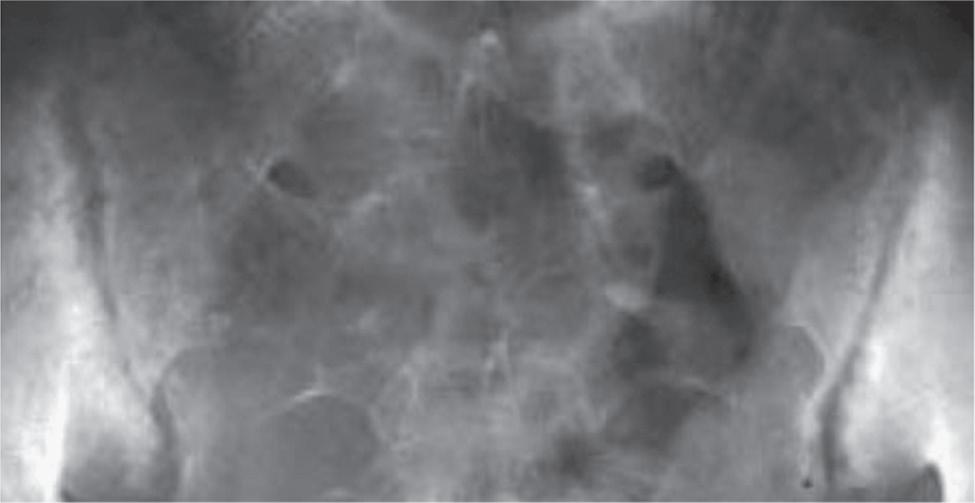 Figure 1.4 The sacroiliac joint: (a) location of the right sacroiliac joint marked by the line separating the sacrum from the ilium, as viewed from the front; (b) pelvic X-ray showing irregularities (bony erosions) of both right and left sacroiliac joints, a characteristic feature of AS.