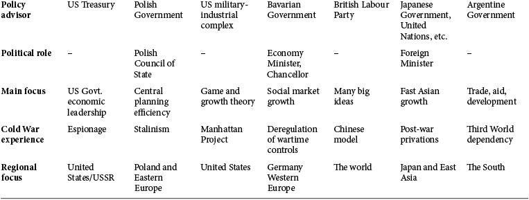 The selected economists are all complex people with different personalities, and they have complex views, some of which they changed over the course of their lives (see Table 0.1). This book does not offer full biographies or complete analyses of their works. Instead, it picks out those aspects of the economists’ lives and thinking that particularly inform the Cold War period and its economic tensions.