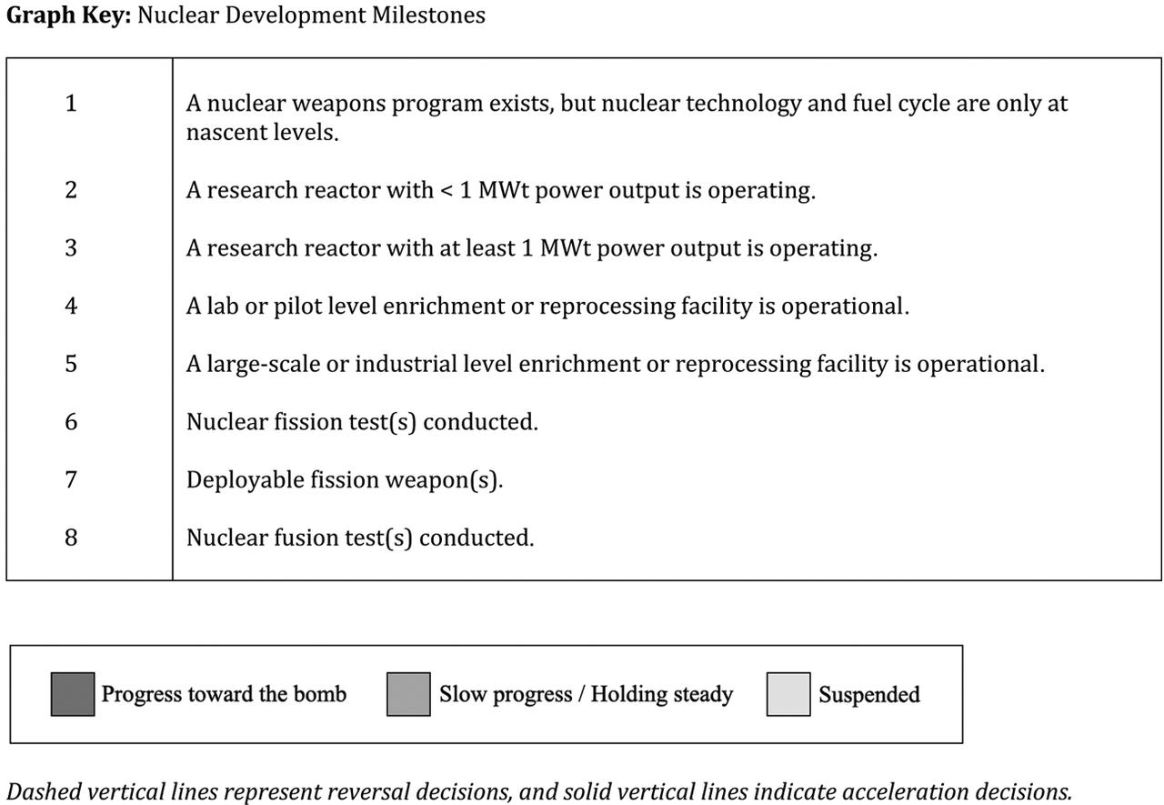Finally, dark, medium, and light gray shadings indicate the status of the program before and after each nuclear decision. Dark gray represents progress toward the bomb, while medium gray indicates that the program is continuing but is holding steady at its current level or is progressing very slowly due to reductions or a lack of interest from the government. Light gray indicates the program has been suspended, either permanently or temporarily.