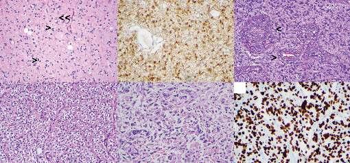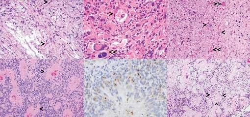 which sometimes may be the dominant feature. Because of the embryonal features, in the past, these tumors were diagnosed as glioblastoma, with primitive neuronal features, or as a CNS embryonal tumor. They are almost always high grade and often have morphological hallmarks of a high-grade glial tumor such as microvascular proliferation and/or palisading necrosis which is very helpful for the correct diagnosis. A GFAPpositive, OLIG2-negative hemispheric tumor with loss of nuclear ATRX staining and diffuse p53 staining in the absence of IDH mutations is highly suggestive of a H3 G34 mutation.