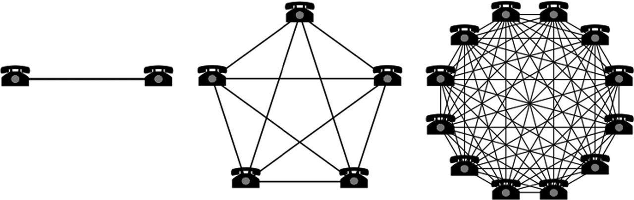 The exponential power of information networks—and consequently of information operations—is shown in Figure I.2. Whereas two telephones are needed to make one connection, five telephones will make ten connections, twelve will make sixty-six connections and so on.27