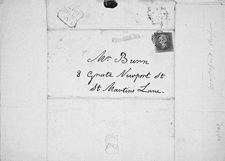 Among the most exciting archival materials are those letters for which the envelopes or wrappers have been retained. We have this for the Mulberynose Snooks letter to Burn, because, as was common in 1847, the address was written on the reverse of the letter, which was then folded and sealed. This side (above) supplies various clues. The 62 in a dashed oval shape over the one penny red stamp shows that it went through a London postal district office, where it was stamped with a particular cancellation mark: this one South Tottenham. These marks were added to letters which had been posted at suburban sorting offices, and to letters from other districts on the same route which had not passed through the chief sorting office.26 There is also a stamp in the shape of a compressed square