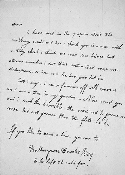 I have re[a]d in the papers about the mulbery would and has I think you is a man with a tidy cheek i think we could due bisnes. but atween ourselves I don’t think doctor Dod ever sor Shakespeare, so how cud Ee hav[e] yur hit imbut i say, i am a fancier off silk wurms an i av a tre[e] in my gardin – Nou coud yu and i work the horrible the wod w[oul]d be grene of corse but not greener than the flats he he. If you like tu send a line you can tu