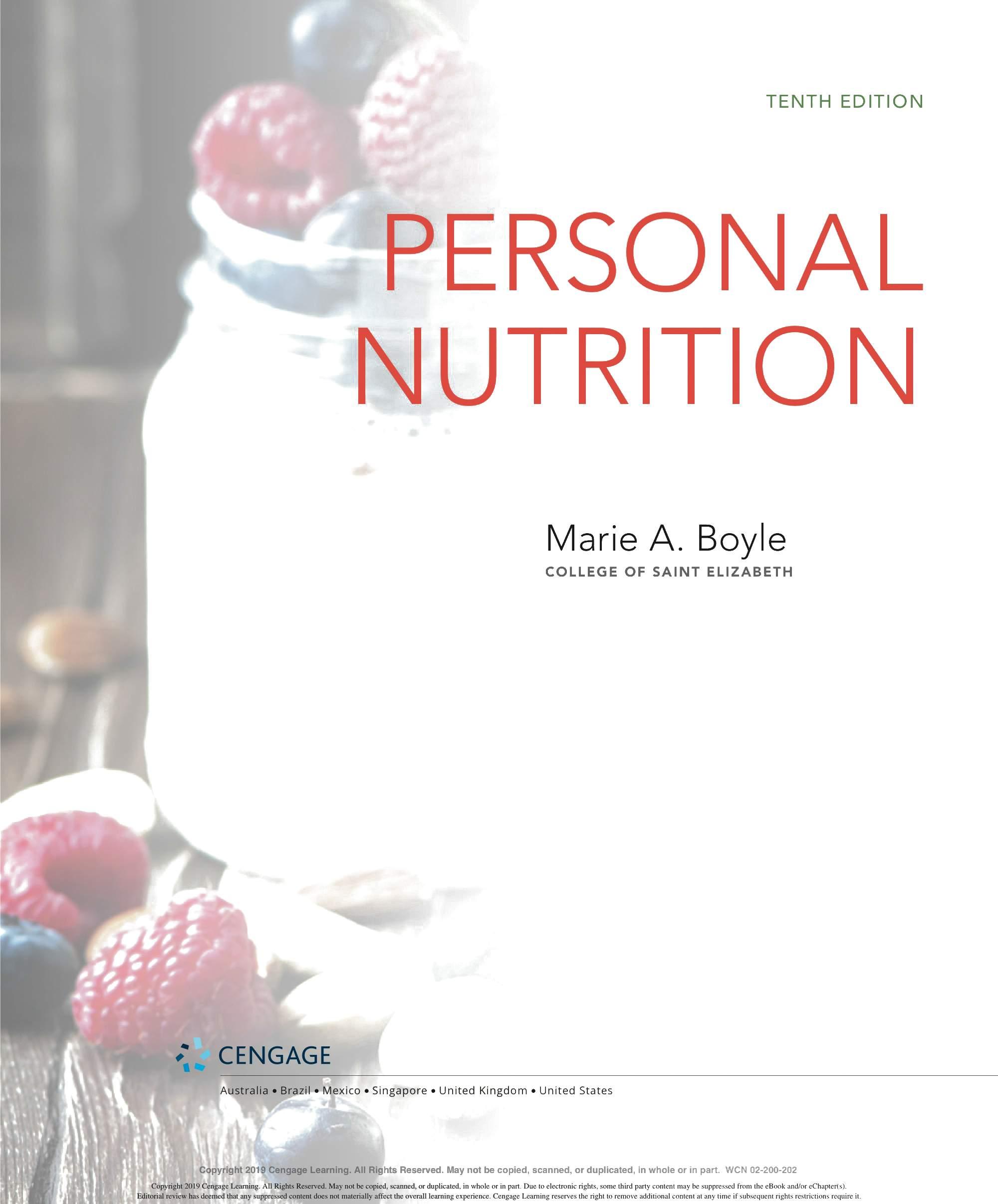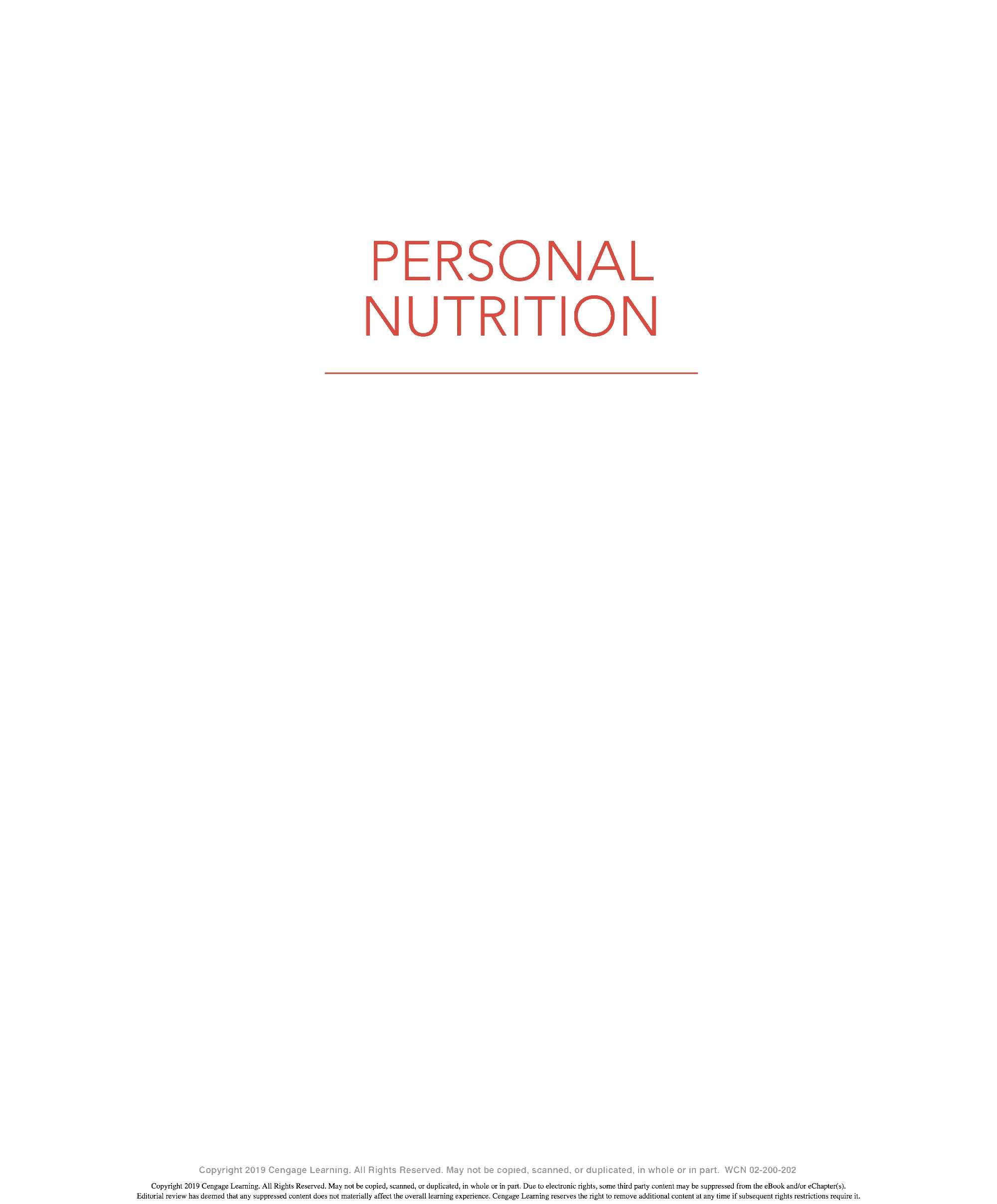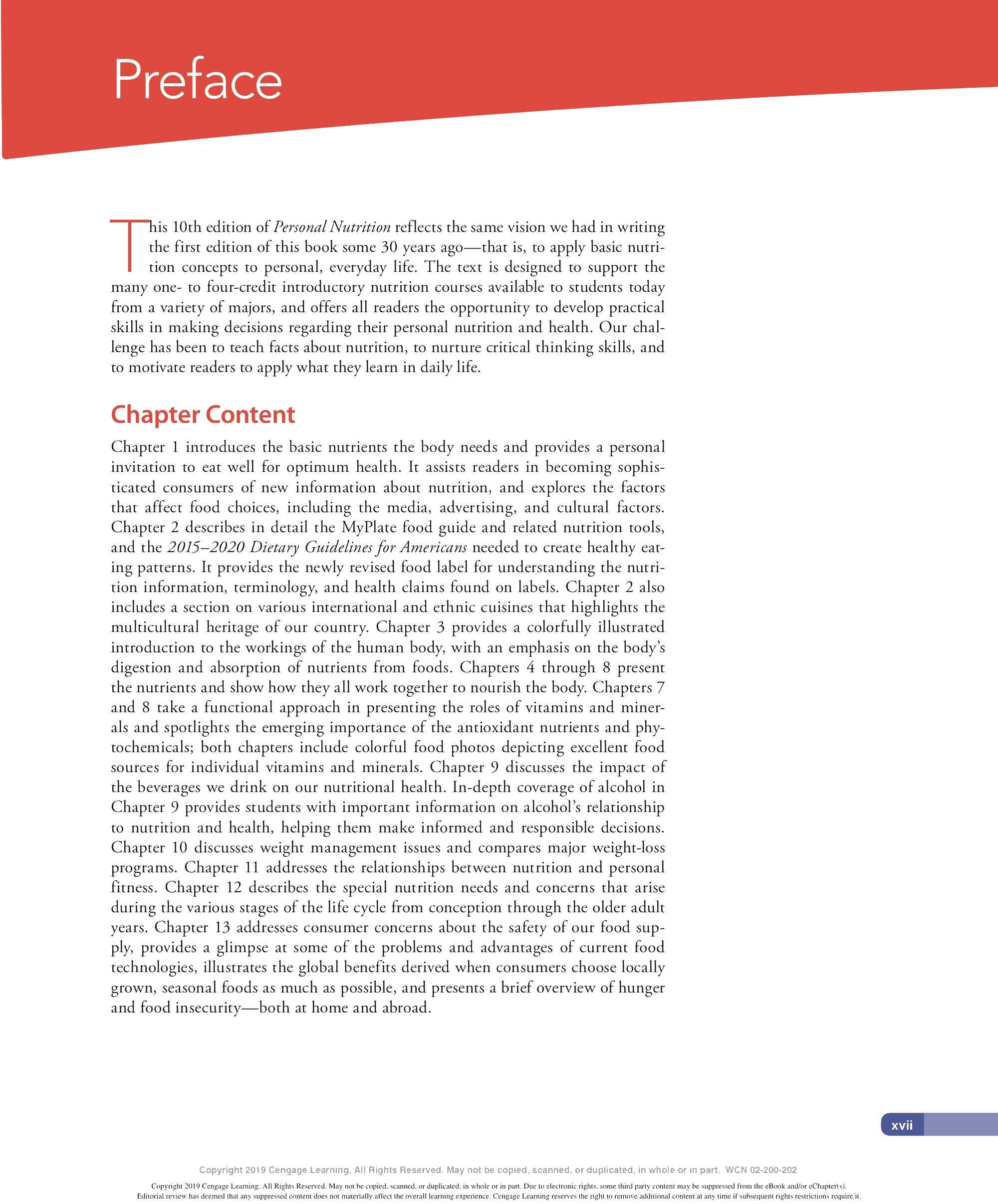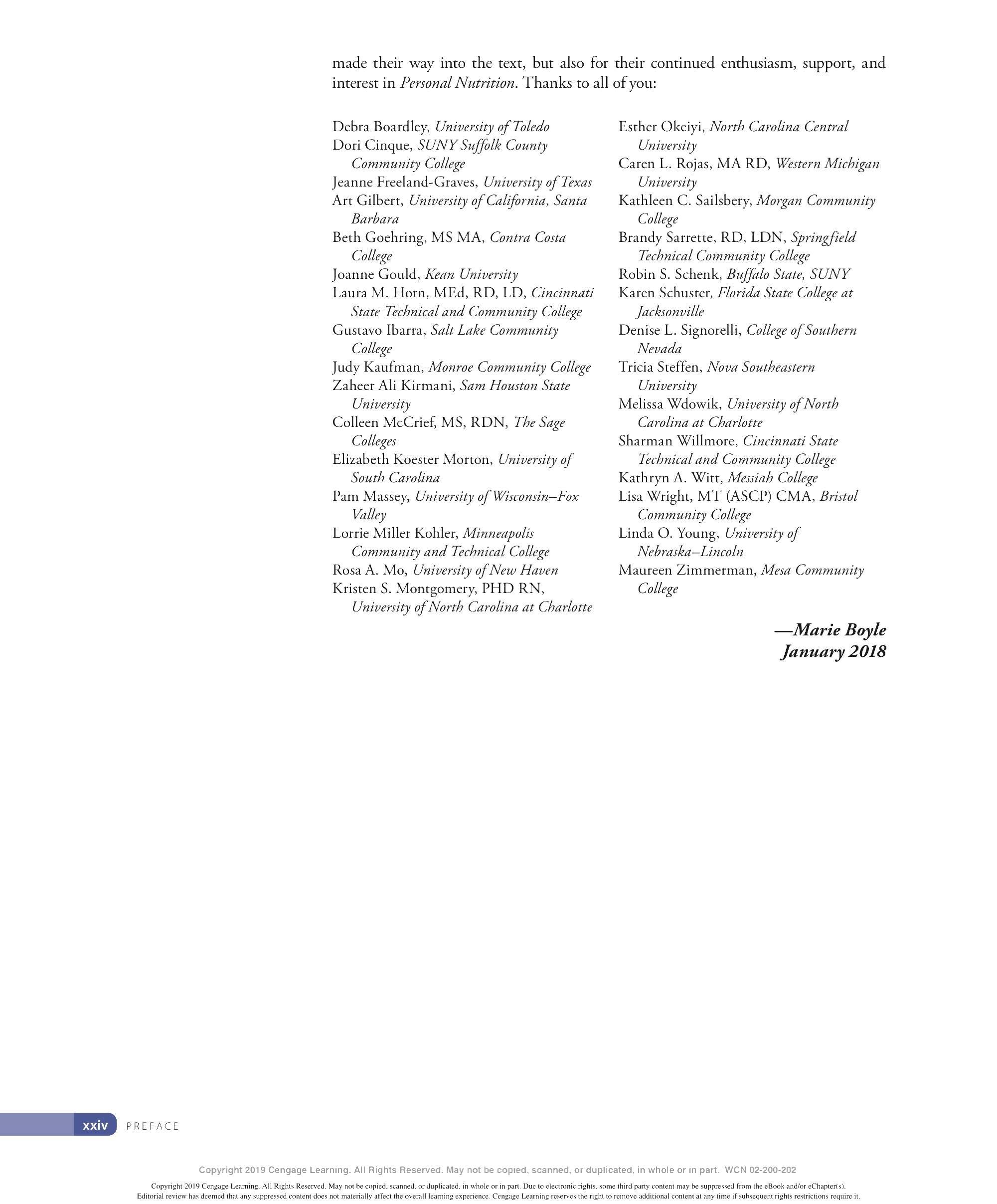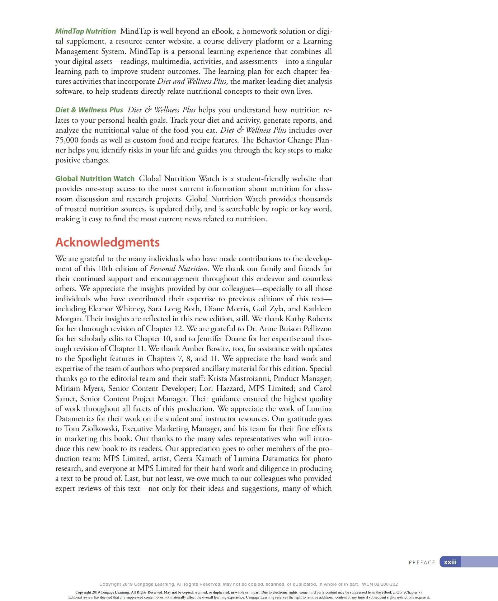 We are grateful to the many ind ivid uals who have made contri b utions to the development of this lOth ed ition of Personal Nutrition. We thank our family and friends for thei r continued support and encouragement throughout this endeavor and countless others. We appr eciate the insights provided by our colleagues - especially to all those ind ivid uals who have contri b uted their expertise to previous editions of this textincluding Eleanor Whitney, Sara Long Roth, Diane Morris, Gail Zyla, and Kathleen Morgan. Their insights are reflected in this new edition, still. We thank Kathy R oberts for her thorough revision of Chapter 12. We are grateful to Dr. Anne Buison Pellizzon for her scholarly ed its to Chapter 10, and to Jennifer D oane for her expertise and thorough r evision of Chapter 11. We thank Am b er Bowitz, too, for assistance with updates to the Spotlight features in Chapters 7, 8, and 11. We appreciate the hard work and expertise of the team of author s who prepa r ed ancilla r y material for this edition. Special thanks go to the editorial team and their staff: Krista Mastroianni, Pro d uct Manager ; Miriam Myers, Senior Content Developer ; Lori H azzard, M PS Li mited ; and Carol Samet, Senior Content Project Manager. Their guid ance ensured the highest quality of wor k throughout all facets of this pro d uction. We appr eciate the wo rk of Lumina Datametr ics for their work on the student and instructor resources. Our gratitud e goes to Tom Ziolkowski, Executive Marketing Manager, and h is team for their fine efforts in marketing this book. Our thanks to the many sales representatives who will introduce this new book to its readers. Our appr eciation goes to other member s of the production team: M PS Limited, artist, Geeta Kamath of Lumina D atamatics for photo research, and everyone at M PS Limited for thei r hard work and diligence in pro d ucing a text to be proud of. Last, but not least, we owe much to our colleagues who provided expert reviews of this text- not only for thei r id eas and suggestions, many of which