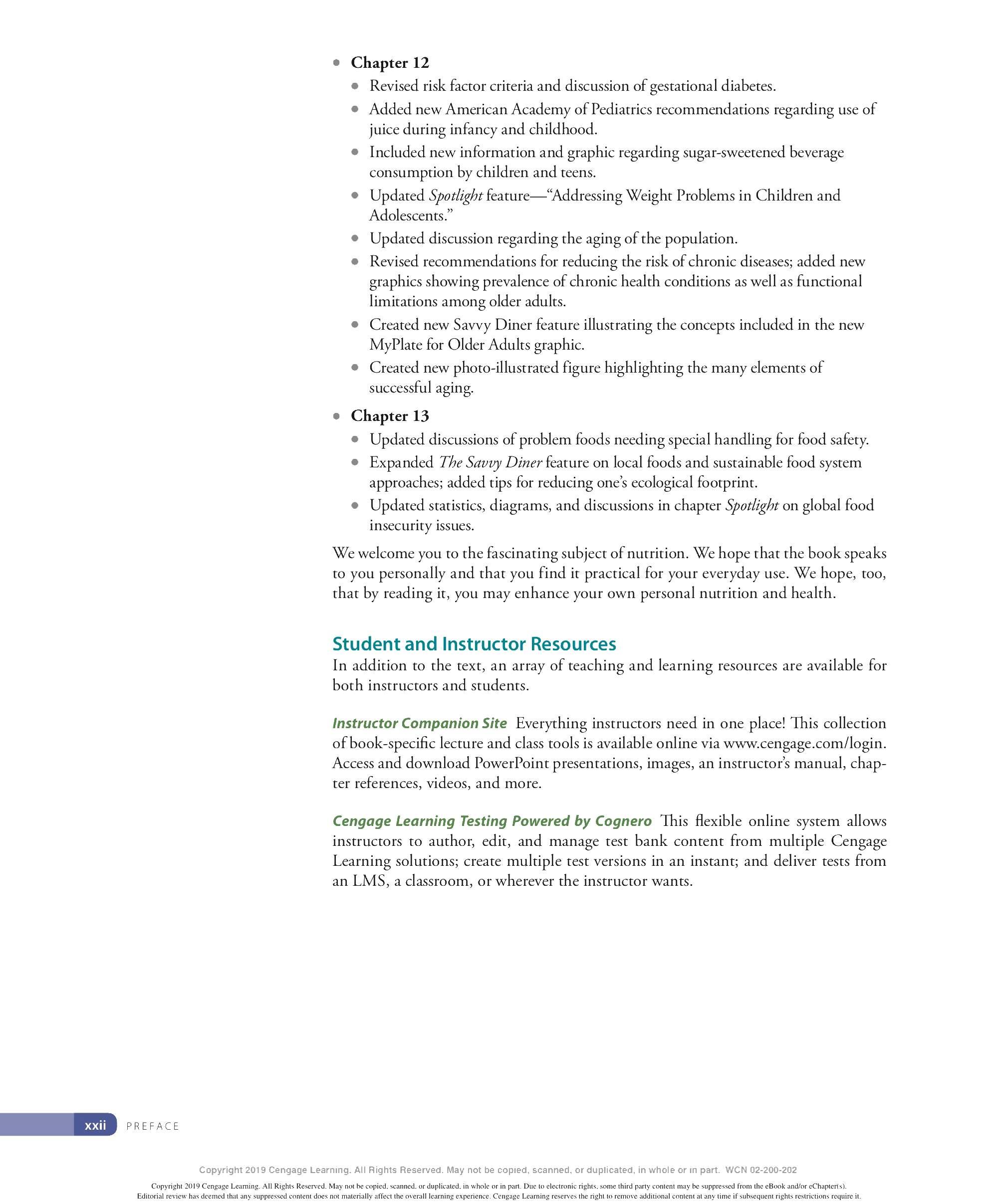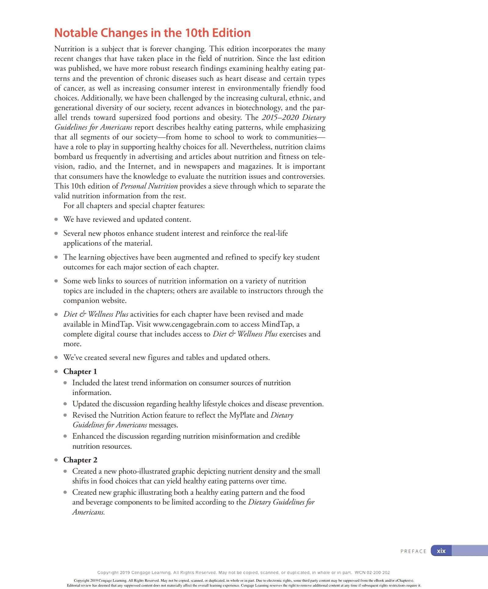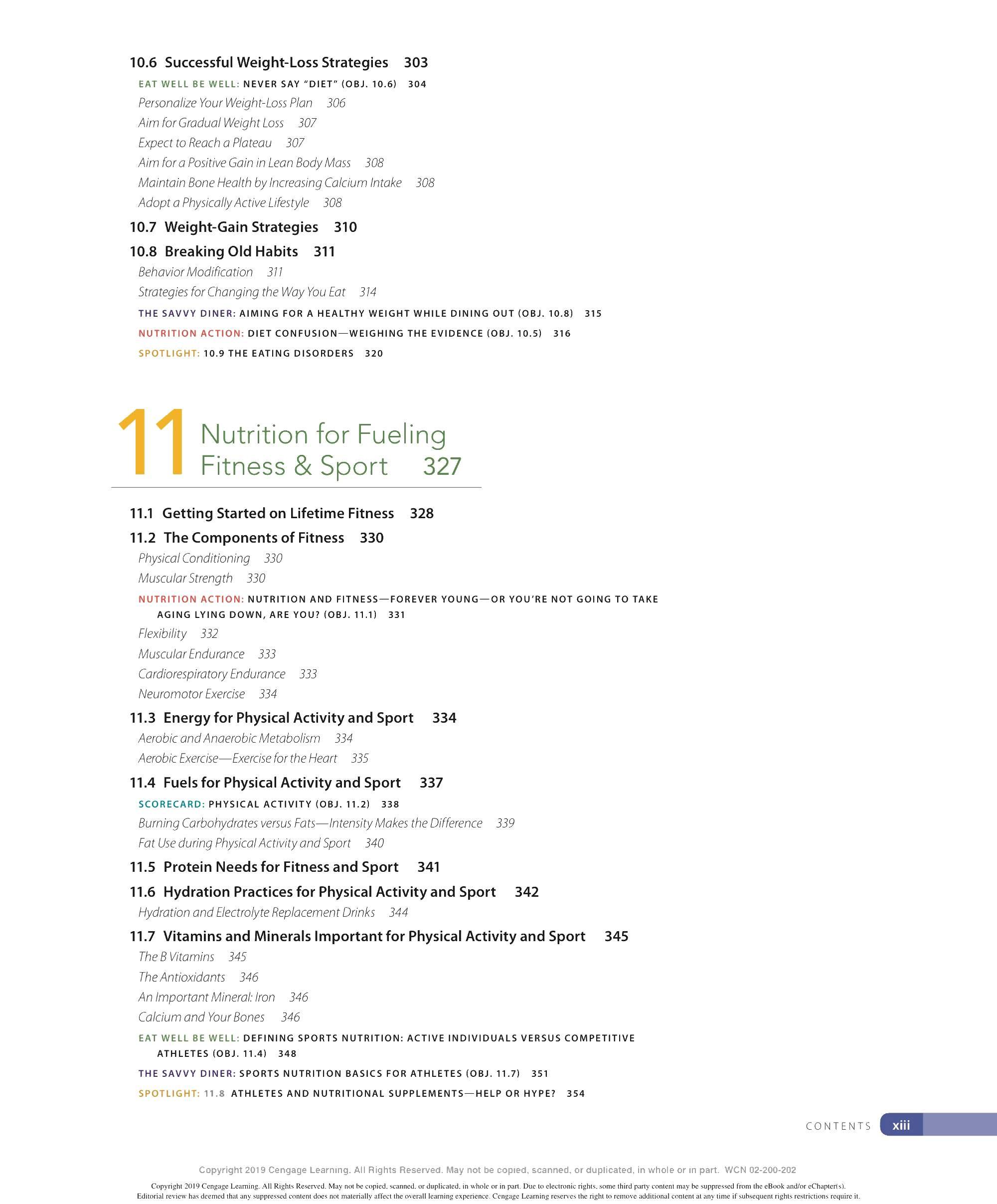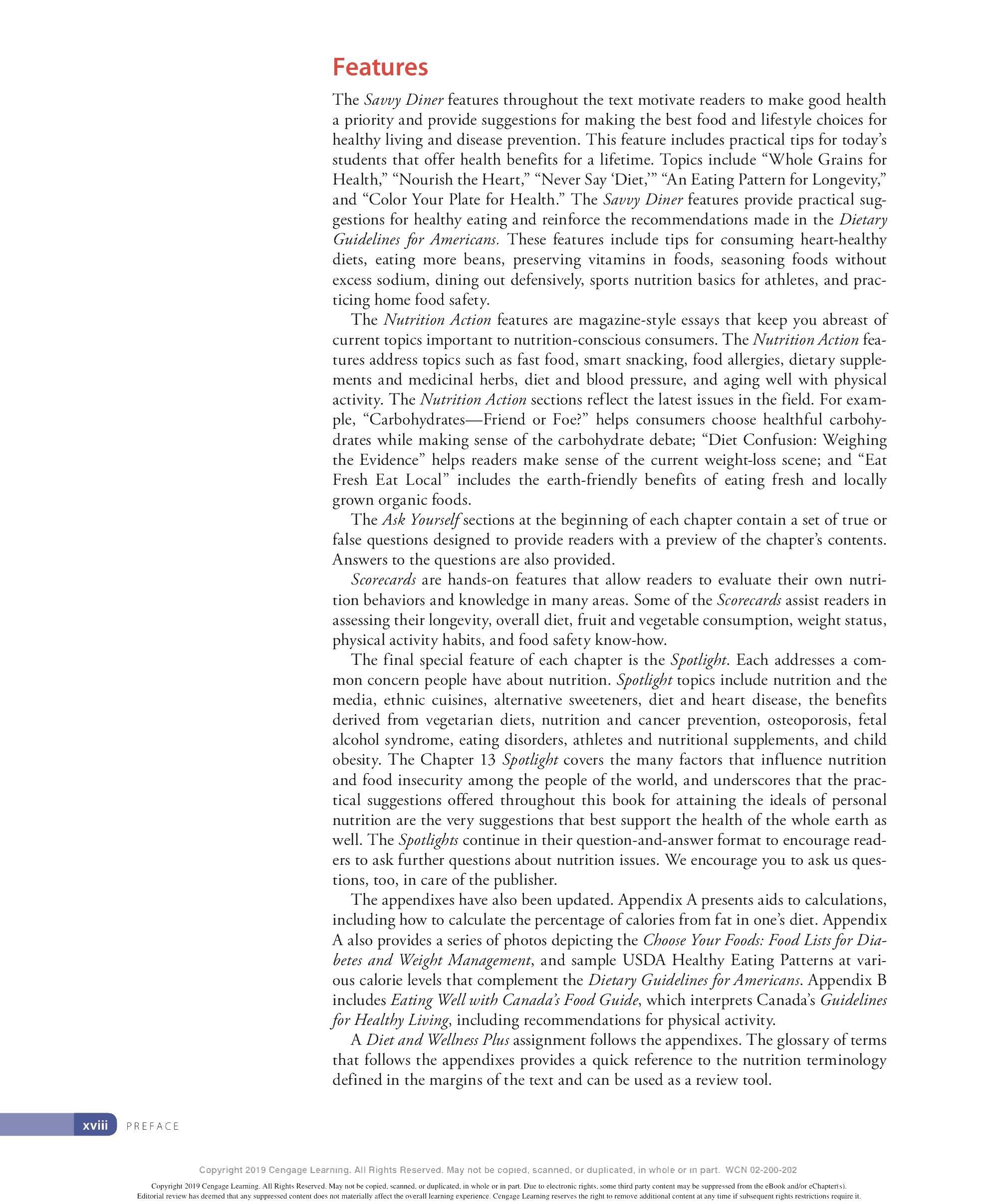 We are grateful to the many ind ivid uals who have made contri b utions to the development of this lOth ed ition of Personal Nutrition. We thank our family and friends for thei r continued support and encouragement throughout this endeavor and countless others. We appr eciate the insights provided by our colleagues - especially to all those ind ivid uals who have contri b uted their expertise to previous editions of this textincluding Eleanor Whitney, Sara Long Roth, Diane Morris, Gail Zyla, and Kathleen Morgan. Their insights are reflected in this new edition, still. We thank Kathy R oberts for her thorough revision of Chapter 12. We are grateful to Dr. Anne Buison Pellizzon for her scholarly ed its to Chapter 10, and to Jennifer D oane for her expertise and thorough r evision of Chapter 11. We thank Am b er Bowitz, too, for assistance with updates to the Spotlight features in Chapters 7, 8, and 11. We appreciate the hard work and expertise of the team of author s who prepa r ed ancilla r y material for this edition. Special thanks go to the editorial team and their staff: Krista Mastroianni, Pro d uct Manager ; Miriam Myers, Senior Content Developer ; Lori H azzard, M PS Li mited ; and Carol Samet, Senior Content Project Manager. Their guid ance ensured the highest quality of wor k throughout all facets of this pro d uction. We appr eciate the wo rk of Lumina Datametr ics for their work on the student and instructor resources. Our gratitud e goes to Tom Ziolkowski, Executive Marketing Manager, and h is team for their fine efforts in marketing this book. Our thanks to the many sales representatives who will introduce this new book to its readers. Our appr eciation goes to other member s of the production team: M PS Limited, artist, Geeta Kamath of Lumina D atamatics for photo research, and everyone at M PS Limited for thei r hard work and diligence in pro d ucing a text to be proud of. Last, but not least, we owe much to our colleagues who provided expert reviews of this text- not only for thei r id eas and suggestions, many of which