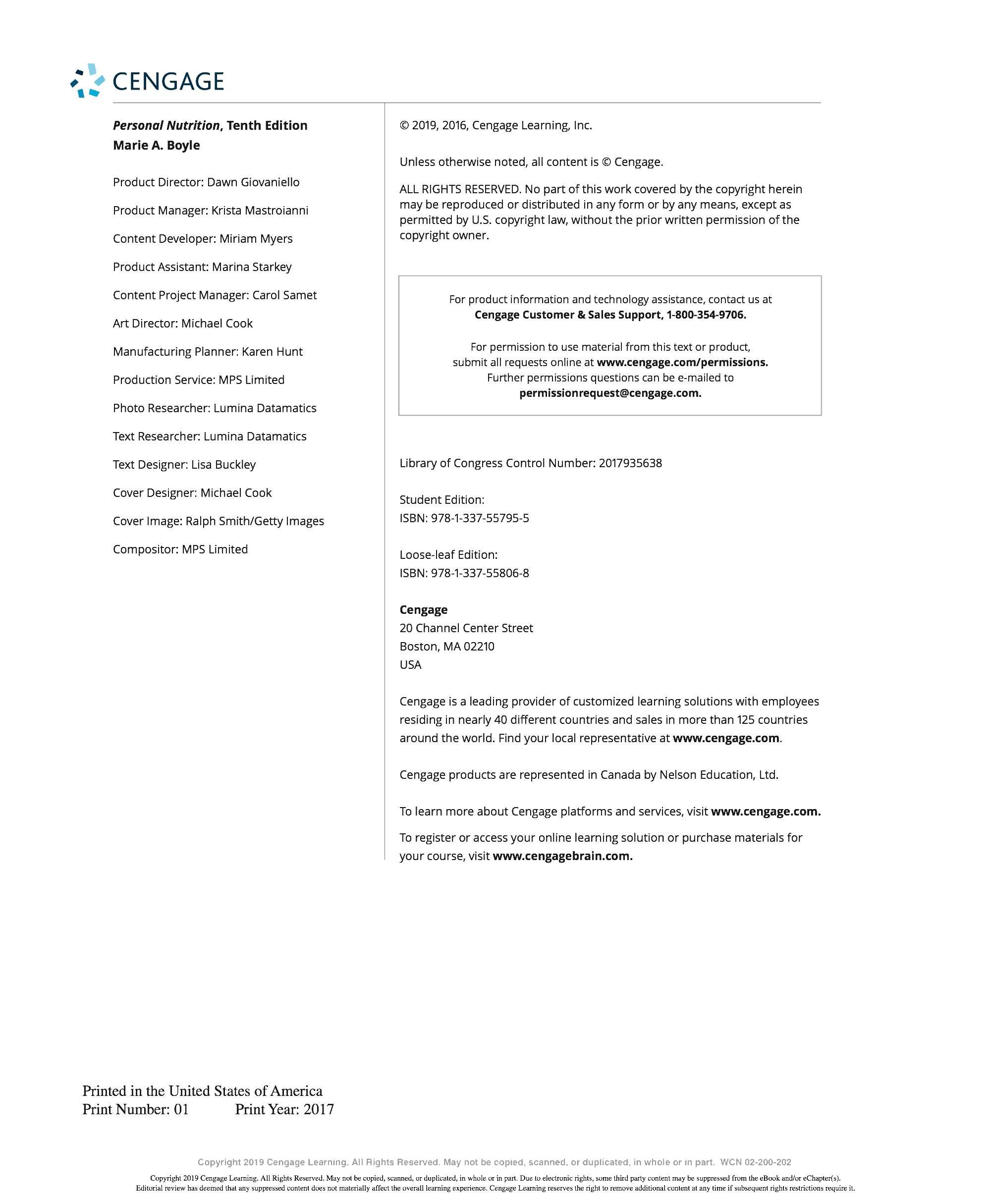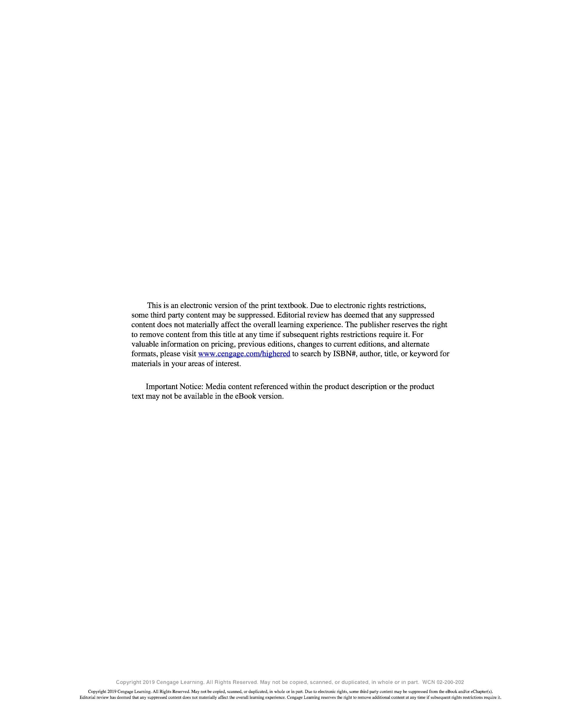 This is an electronic version of the print textbook. Due to electronic rights restrictions, some third party content may be suppressed. Editorial review has deemed that any suppressed content does not materially affect the overall learning experience. The publisher reserves the right to remove content from this title at any time if subsequent rights restrictions require it. For valuable information on pricing , previous editions, changes to current editions, and alternate formats, please visit www cengage com/hig h ered to search by ISBN#, author, title , or keyword for materials in your areas of interest.