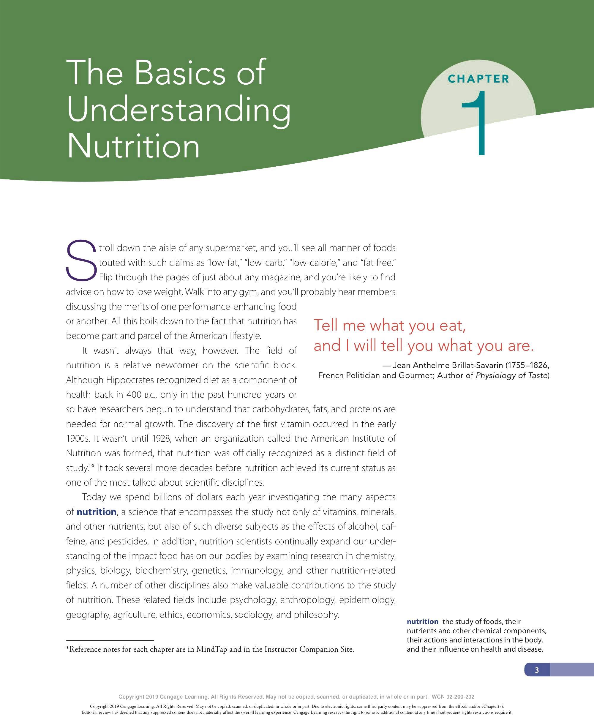 Today we spend billions of dollars each year investigating the many aspects of nutrition , a science that encompasses the study not only of vitamins, minerals, and other nutrients, but also of such diverse subjects as the effects of alcoho l, caffeine, and pesticides. In addition, nutrition scientists continua ll y expand our understanding of the impact food has on our bodies by examining research in chemistry, physics, biology, biochemistry, genetics, immunology, and other nutrition-related fields. A number of other discip lin es also make va lu ab le contributions to the study of nutrition. T hese related fields include psychology, anthropo lo gy, epidemio lo gy, geography, agricu lture, ethics, economics, socio lo gy, and philosophy.