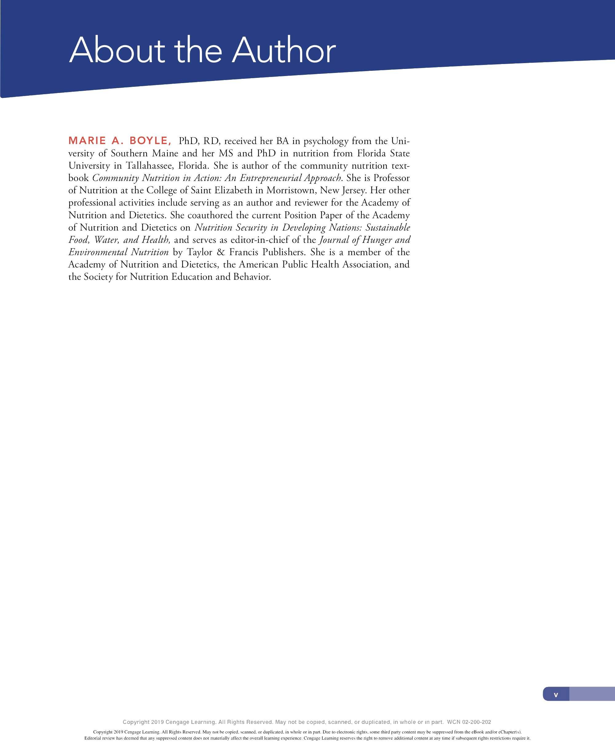 MARIE A. BOYLE, PhD, RD, received her BA in psychology from the University of Southern Maine and her MS and PhD in nutrition from Florida State University in Tallahassee, Florida. She is author of the community nutrition te x tbook Community Nutrition in Action: A n Entrepreneurial Approach. She is Professor of Nutrition at the College of Saint Elizabeth in Morristown, New Jersey. Her other professional activities include serving as an author and re v iewer for the Academy of Nutrition and Dietetics. She coauthored the current Position Paper of the Academy of Nutrition and Dietetics on Nutrition Security in Developing Nations: Sustainable Food, Water, and Health, and serves as editor-in-chief of the journal of Hunger and Environmental Nutrition by Taylor & Francis Publishers. She is a member of the Academy of Nutrition and Dietetics, the American Public Health Association, and the Society for Nutrition Education and Behavior.