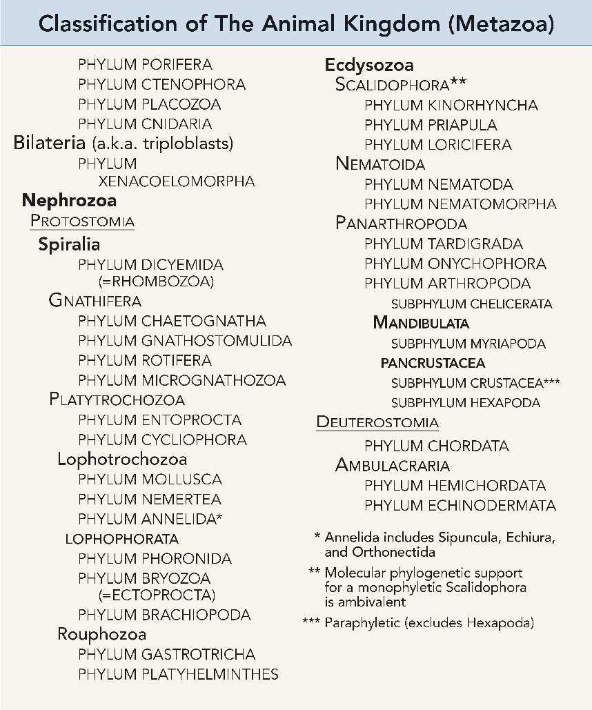 A phylogeny of Metazoa. This tree reflects a consensus view based primarily on recent molecular phylogenetic analyses. The 31 animal phyla are in boldface, whereas subphyla and other clades are in lightface. Spiralian lineages are in red, ecdysozoan lineages are in green, deuterostome lineages are in tan. Uncertainty still exists in several regions, and these are depicted as polytomies (“starbursts”). Thus, for example, the branching sequence for Placozoa, Cnidaria, and Bilateria is not yet resolved, so it is shown as an unresolved trichotomy. Similarly, two large polytomies exist among the Platytrochozoa, and the relationships of the three ecdysozoan clades are still unresolved, as are those of the three scalidophoran phyla. Due to uncertainty, Dicyemida is depicted in an unresolved trichotomy with Gnathifera and Platytrochozoa. See Chapter 28 for additional details.