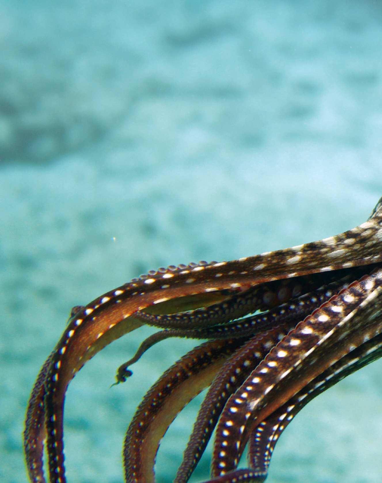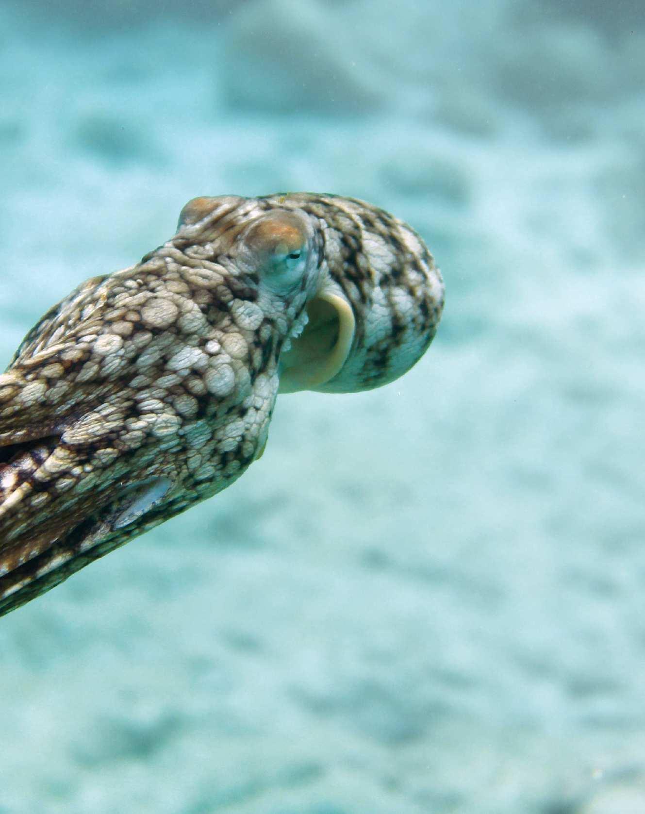 Found throughout the tropical Indo-Pacific, this is the most commonly seen octopus in Hawai’i. Hidden in a lair on the reef floor by night, the octopus will reach out with tentacles to gather coral rubble to protect the entrance. When at rest in its lair, it is a uniformly dark reddish-brown but during the day when hunting crabs on the reef bottom, it displays a spectacular array of color patterns and textures to match the varied landscape it crosses. An ink cloud released during escape contains mucus, melanin, dopamine, and tyrosinase, and is thought to confuse a fish predator and to depress its olfactory ability.