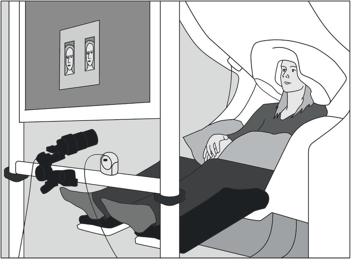 dewar housing the sensor array. She can speak and moderately move her hands and eyes, although in that case some artifact-suppression methods may be needed. Her facial and bodily actions can be recorded with a video and monitored with response pads, accelerometers, and surface electromyogram (electrical activity from muscles), also including the electro-oculogram. The electrocardiogram (electrical activity from the heart) can also be recorded.