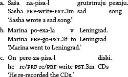 But even that conclusion is difficult to sustain when other properties of the system of morphological marking of aspect are brought to bear on the analysis of Slavic verbal morphology. A variety of prefixes attach to the verb to contribute new aspectual information. Some examples of Russian verbs with such aspectual prefixes appear in (7).