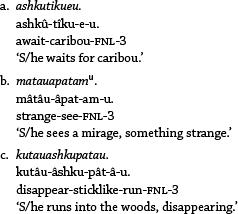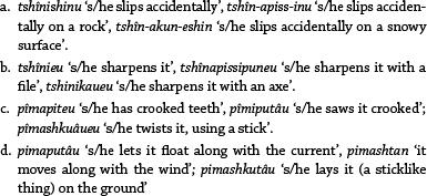 In the (12a) verbs, the combination of a tshininitial and the finalsin, -shin, and -eshin signifies a slipping action. But in (12b), the same initial combines with -e, pune-, and -ue to mean ‘sharpen’. In both cases, the contribution of the medial to the overall meaning is determined only on the basis of the semantics of the initial-final pairing. So apiss ‘stone’ and akun‘snow’ are the surfaces to slip on in (12a) while apiss and ika are the tools used for sharpening in (12b). Similarly, (12c) and (12d) examples differ in what initial pim means: with finals in (12c), it means ‘crooked’, but with the finals that signify a type of motion in (12d), it means ‘along’. And the presence of medial -ashku ‘sticklike’ does not affect the initial-final relationship in either case.