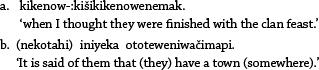 Aside from the relatively greater difficulty of examining syntactic structures generally, one reason for this analytic imbalance in the literature has to do with the enormous wealth in expressive opportunities which are provided by individual words in these languages. It is common in descriptions of polysynthetic languages to read that a single word can be an entire sentence, but in many polysynthetic languages, these word-sized sentences convey fairly simple propositions. In Algonquian languages, the morphological complexity of the verb allows word-sized sentences to convey remarkably complex ideas. Thus, for example, Goddard (1988) shows that in Mesquakie (Fox), a single word may express what English would require a multi-clausal structure to convey: (9a).