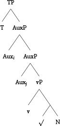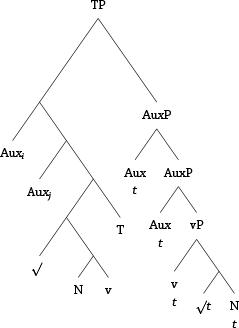 Suppose that v triggers multiple head-movement of both √ and N, while T triggers multiple head-movement of each Aux and of v. Then the result of all the movements triggered in (2) will be a structure like (3).