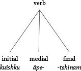 immediate constituents of primary stems are finals, medial suffixes (or medials) and roots.” In other sections, he uses the term “initial” in place of ‘root,’ particularly when the “initial” is itself bimorphemic. For an Innu-aimûn verb like kuîshkuâpetshinam‘straighten a cordlike object manually’, for example, the tripartite structure would be as in (10).
