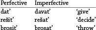 have to do with how the grammar generates verbs—and some participial and nominalized forms derived from them—in which nuanced aspectual distinctions are expressed morphologically. The general problem is evident in even relatively simple verbs, where the significant distinction between perfective and imperfective forms must be treated. (Why and how this distinction is significant for the syntactic derivation will be discussed in detail in Chapter 3.) For example, while most Russian simplex verbs are automatically imperfective, a small class of verbs are inherently perfective, including rešit’‘to decide’ and dat’‘to give’, among others. Inherently perfective verbs can be made imperfective by the addition of a secondary imperfective suffix, which provides the verb pairs in the table (4).2