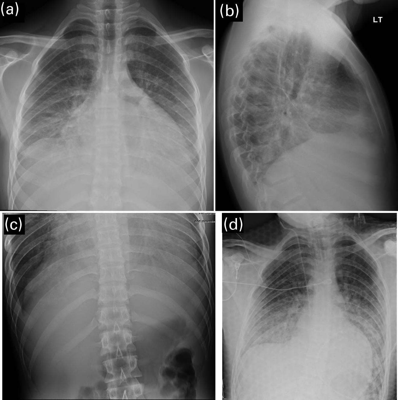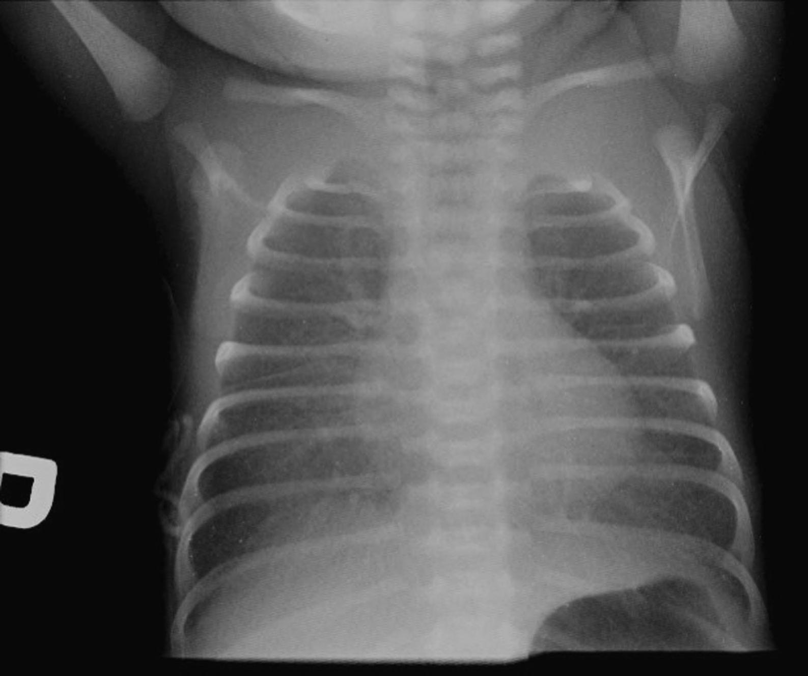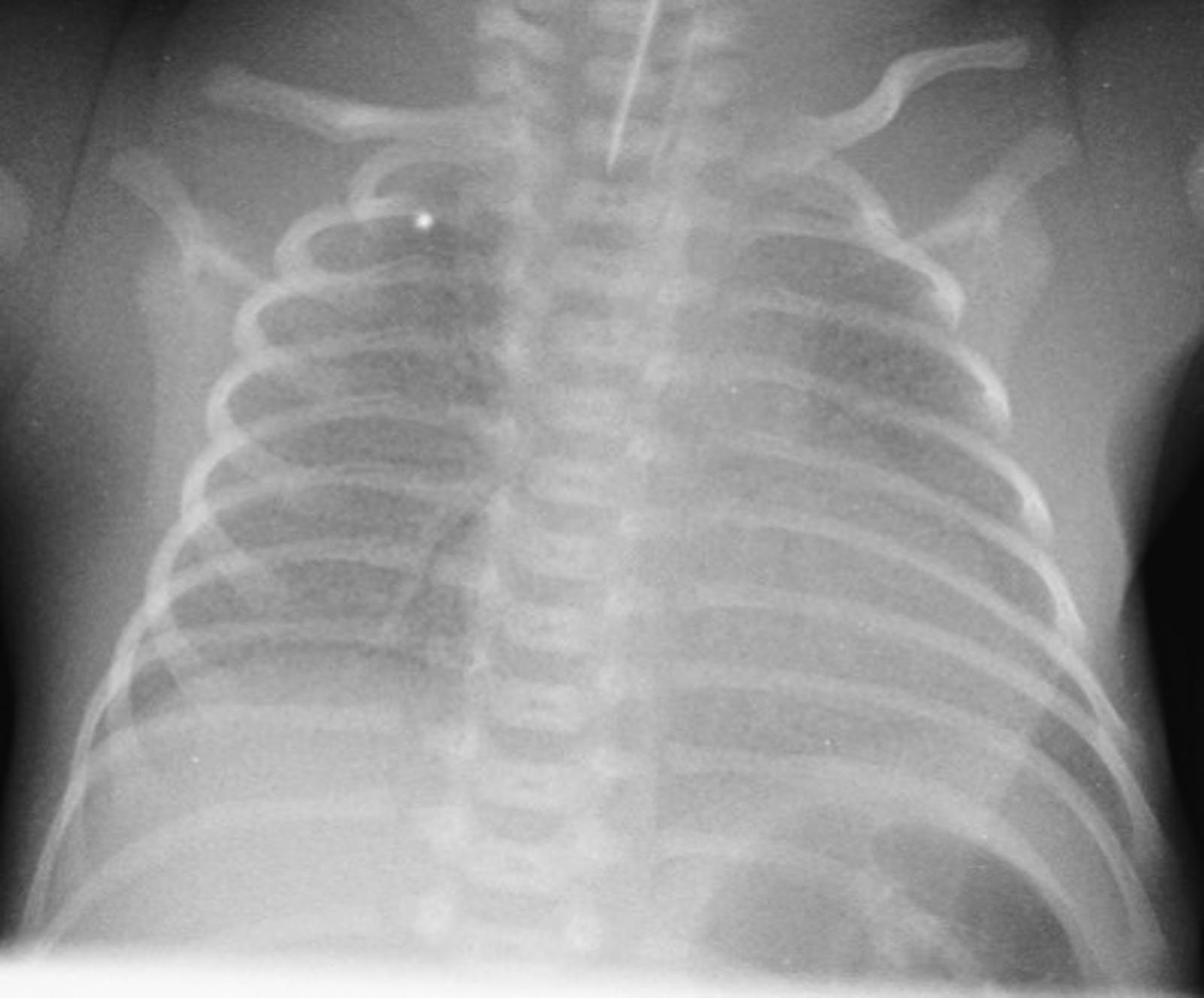 A 7-day-old female patient is brought to your emergency department by ambulance for difficulty breathing. She was born via spontaneous vaginal delivery at 37 weeks gestation and had an uncomplicated hospital stay and was discharged at the end of day 2 post-delivery. Over the past day she began developing a cough and fever to 101°F, decreased feeding, and “fast breathing”. Her vital signs are significant for a heart rate of 180 beats per minute, a rectal temperature of 102.1°F, a blood pressure of 78/44mmHg, a respiratory rate of 70 breaths per minute, and an oxygen saturation of 85% on room air. On physical examination she appears lethargic. She is tachypneic with retractions bilaterally, slightly dry mucous membranes, and coarse breath sounds over the right lower lobe. Despite supplemental oxygen via nasal cannula at 6 liters per minute, her oxygen saturation only increases to 91%. Her chest radiograph (CXR) is seen in Figure 2.1.
