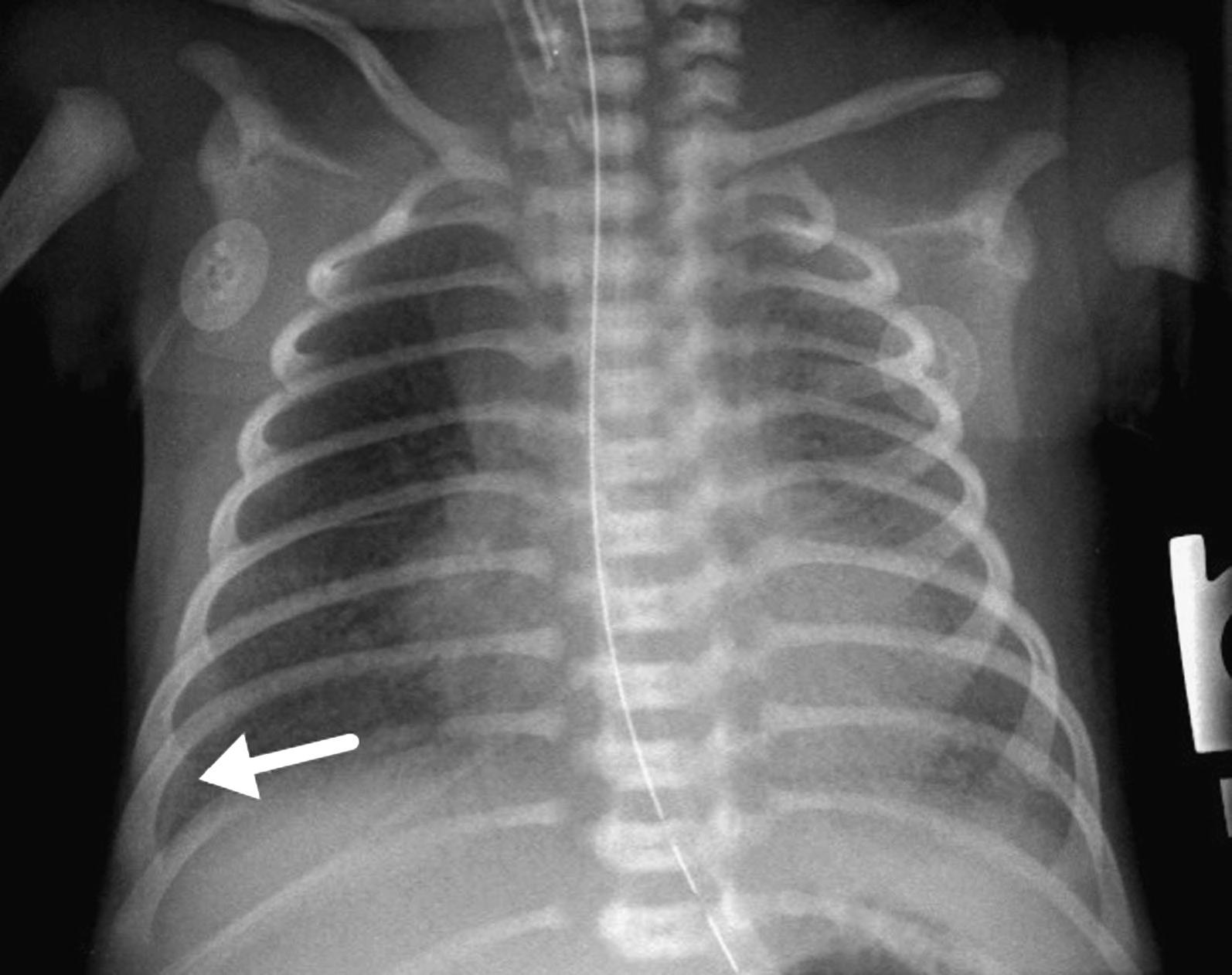FIGURE 2.4. Neonatal pneumonia in a neonate with a small right pleural effusion (arrow) and diffuse left and right lower lobe hazy pulmonary opacification.