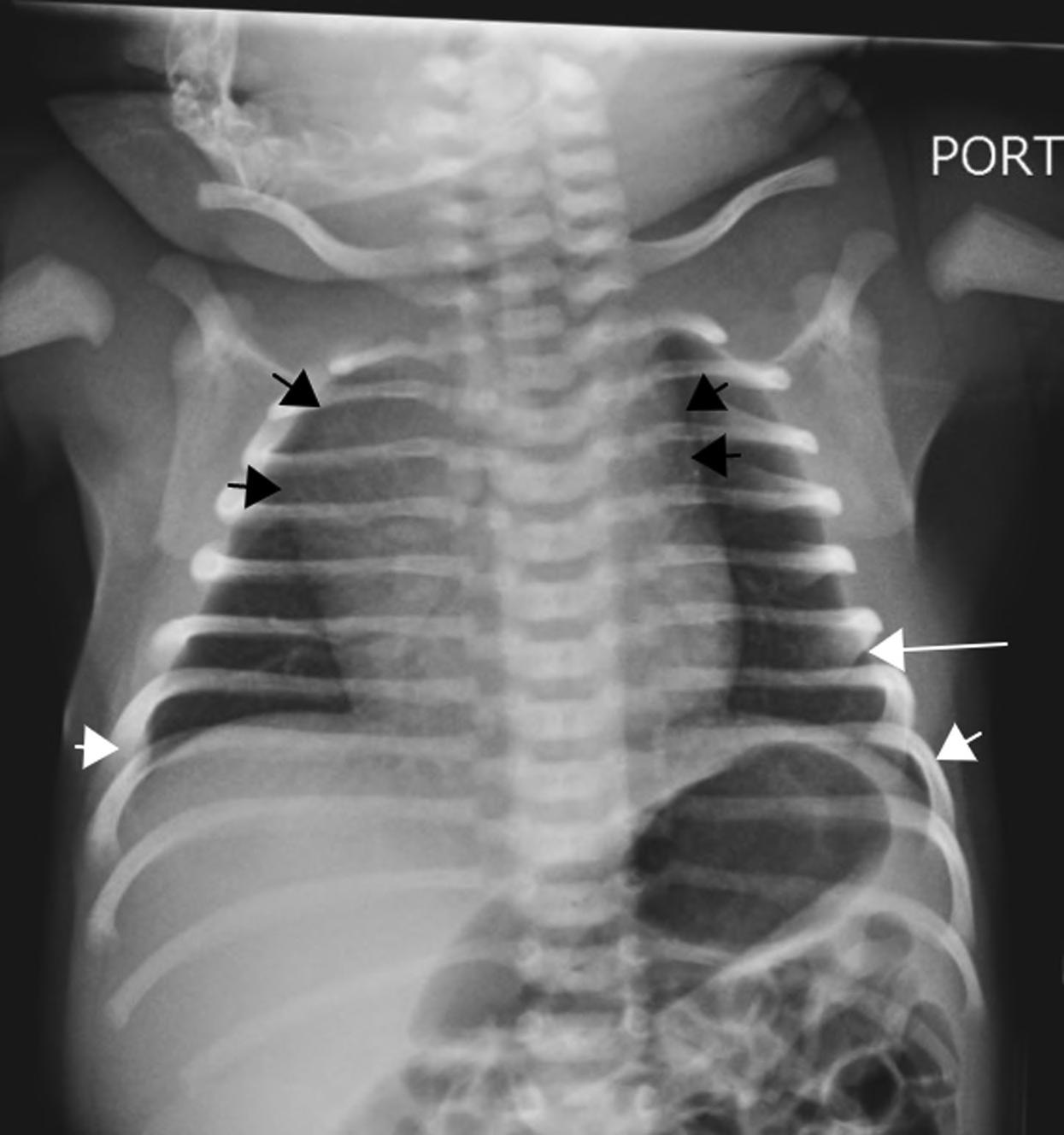 2.2. A normal neonatal chest radiograph. Note the sharp costophrenic angles (small white arrows), the aerated lung extending below the level of the 6th rib anteriorly (long white arrow), and the contour of a normal for age thymus expanding the superior mediastinum (small black arrows).
