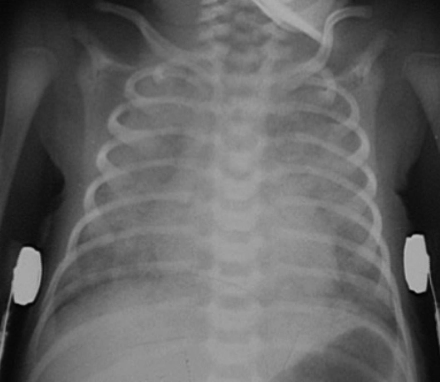 CXR reflects the underlying alveolar instability due to abnormal surface tension, demonstrating ground-glass/granular opacities and air bronchograms, as seen in Figure 2.5. Low lung volumes were classically described, but most neonates undergo imaging while under positive pressure support, often resulting in hyperinflation on the radiograph. Pleural effusions are not typical and may be an important clue to the possibility