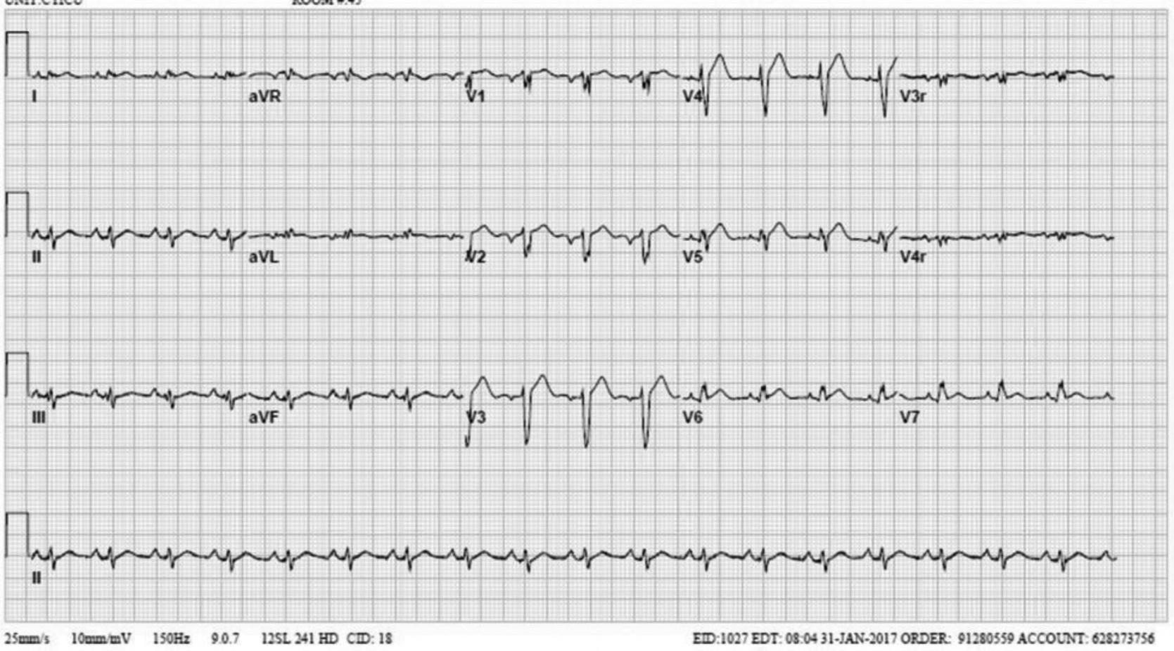 In addition, the physician ordered an electrocardiogram (ECG). An ECG with a chest radiograph is a great screening tool set for cardiomyopathy of any type. ECGs are particularly valuable in patients who present with symptoms that may be suspicious for cardiac involvement and include dyspnea, fatigue, shortness of breath, tachypnea, unexplained tachycardia, murmur, gallop, rub, vague abdominal pain, etc.