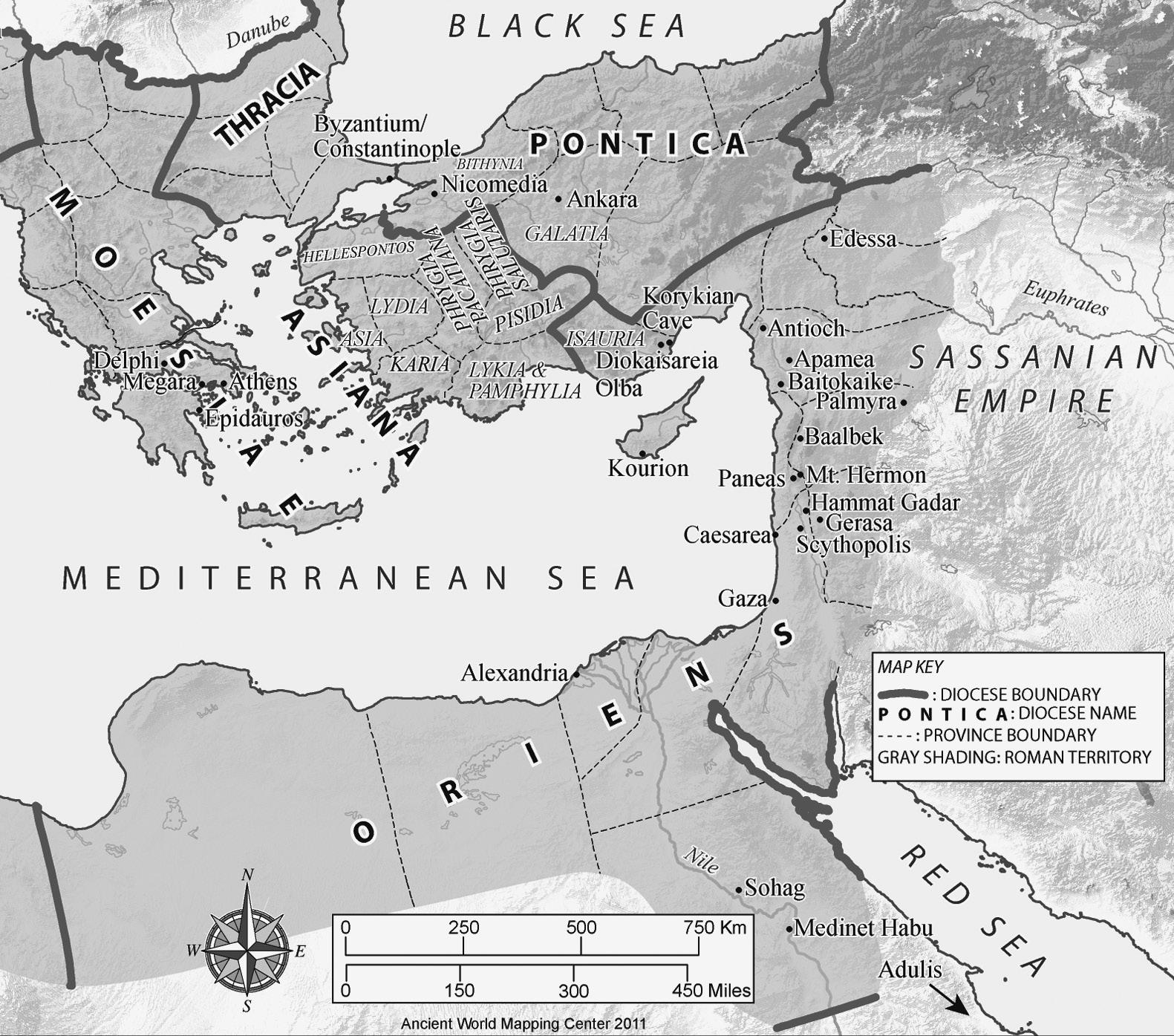 Map 1 Eastern Mediterranean in the time of Diocletian and Constantine, with the province names in western Asia Minor. Ancient World Mapping Center © 2023 (awmc.unc.edu). Used by permission, with modifcations.