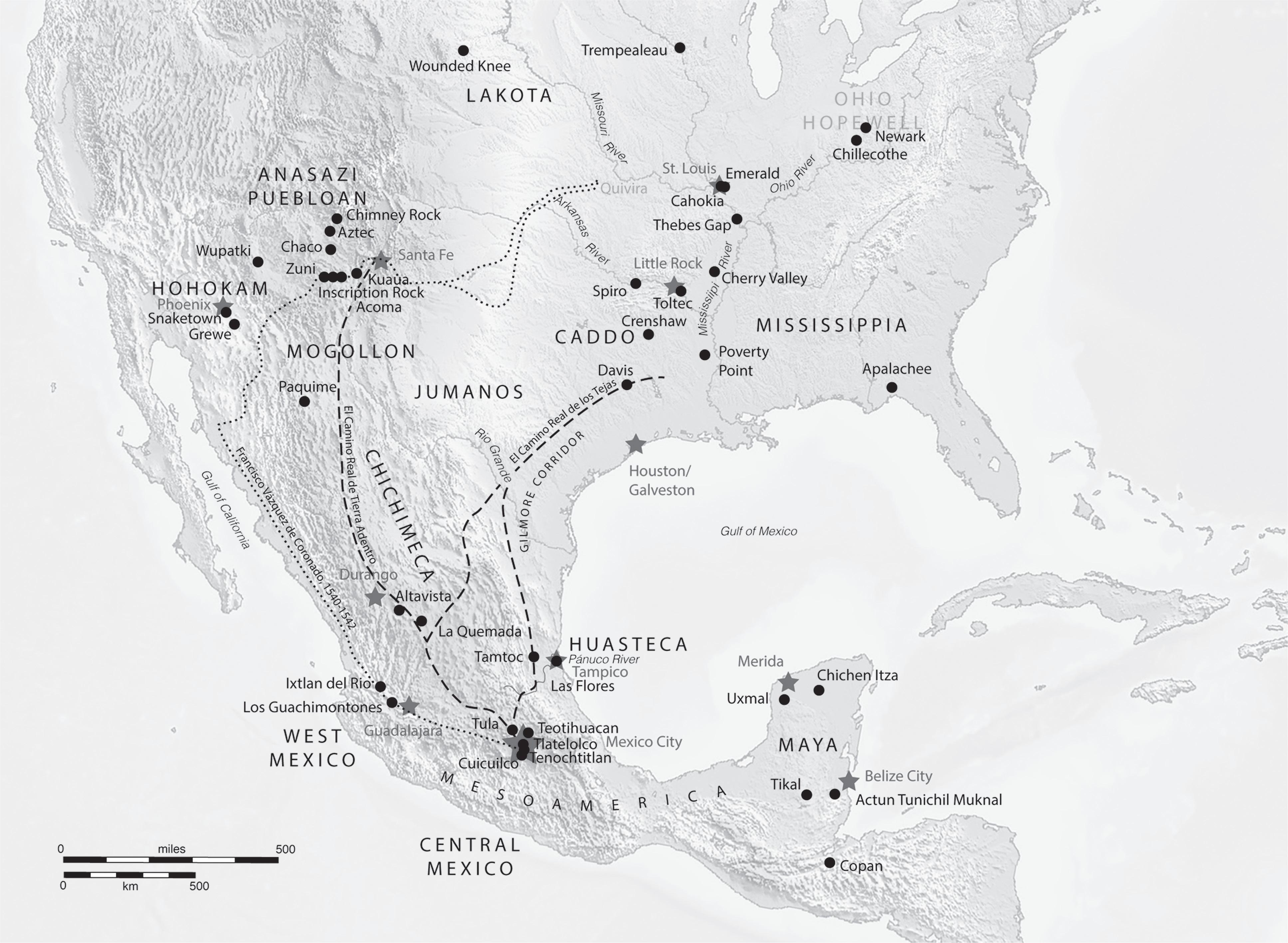 This book is both a result of my National Endowment for the Humanities fellowship (NEH FA-58536-15 FLLW) in 2015–2016, and a request by Stefan Vranka, executive editor, Oxford University Press, that I write a cross-border history of precontact North America. It is also the second in a two-part history of medieval-era Greater Mesoamerica—a historically amorphous chunk of the continent from the Yucatan Peninsula up through Mexico into the American Southwest and, then, over into the Deep South and up the Mississippi Valley. The first volume was Cahokia: Ancient America’s Great City on the Mississippi (Penguin, 2009). For this second volume, I am grateful both to Stefan and to Jason Boffetti, program officer for NEH, who helped me juggle both the fellowship and a collaborative research grant.