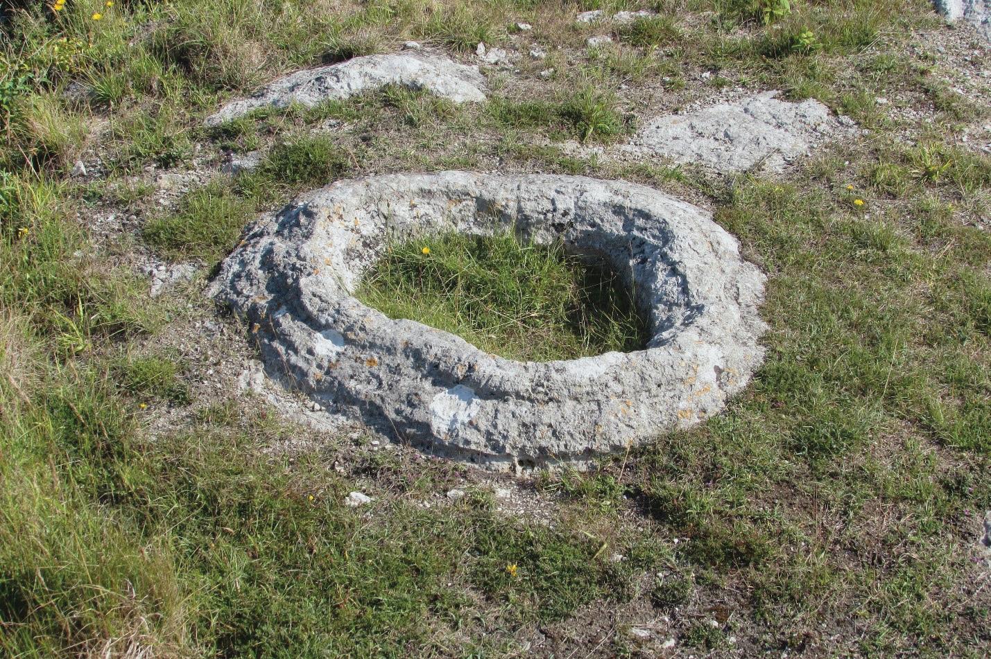 Figure 1.10 A thrombolite from King Barrow (Kingsbarrow) Quarry, at the north end of Portland. It is about 1 metre across. Te central hole once contained a tree stump, rooted in the Great Dirt Bed palaeosol below (ASG).