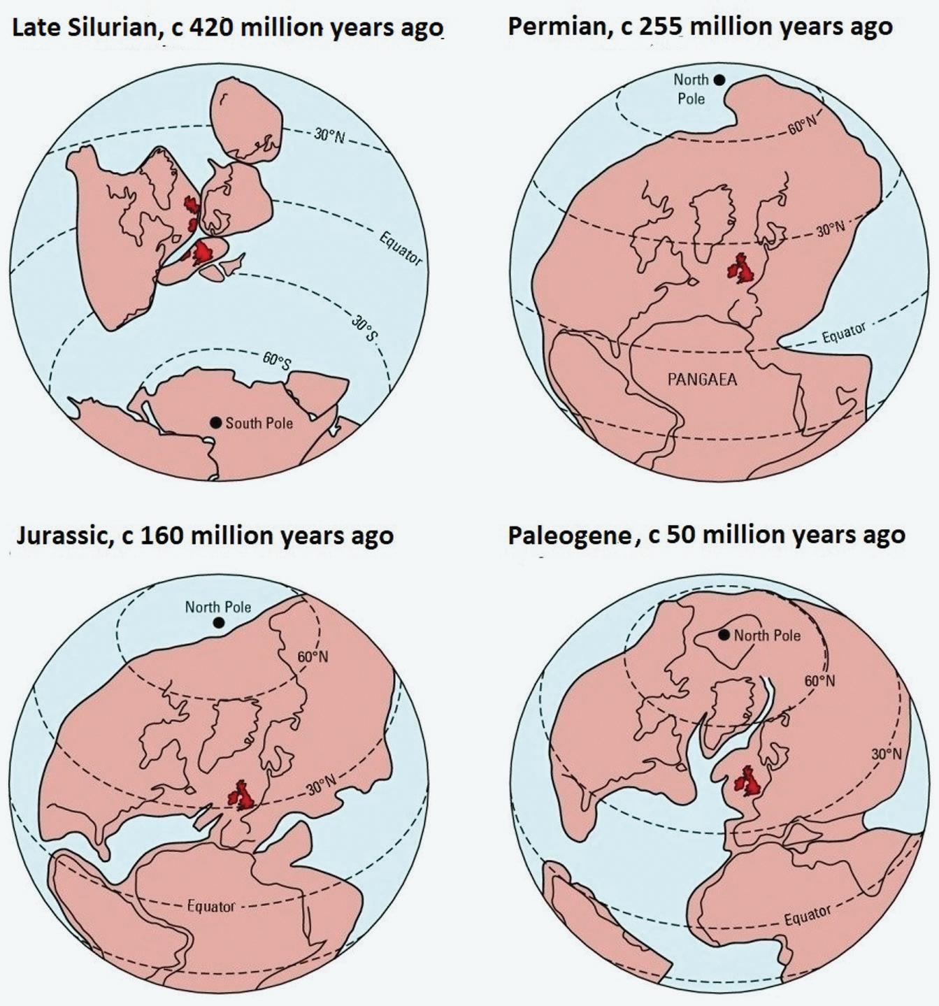 Figure 1.5 Te changing latitudinal position of the British Isles (shown in red) through geological time (ASG).