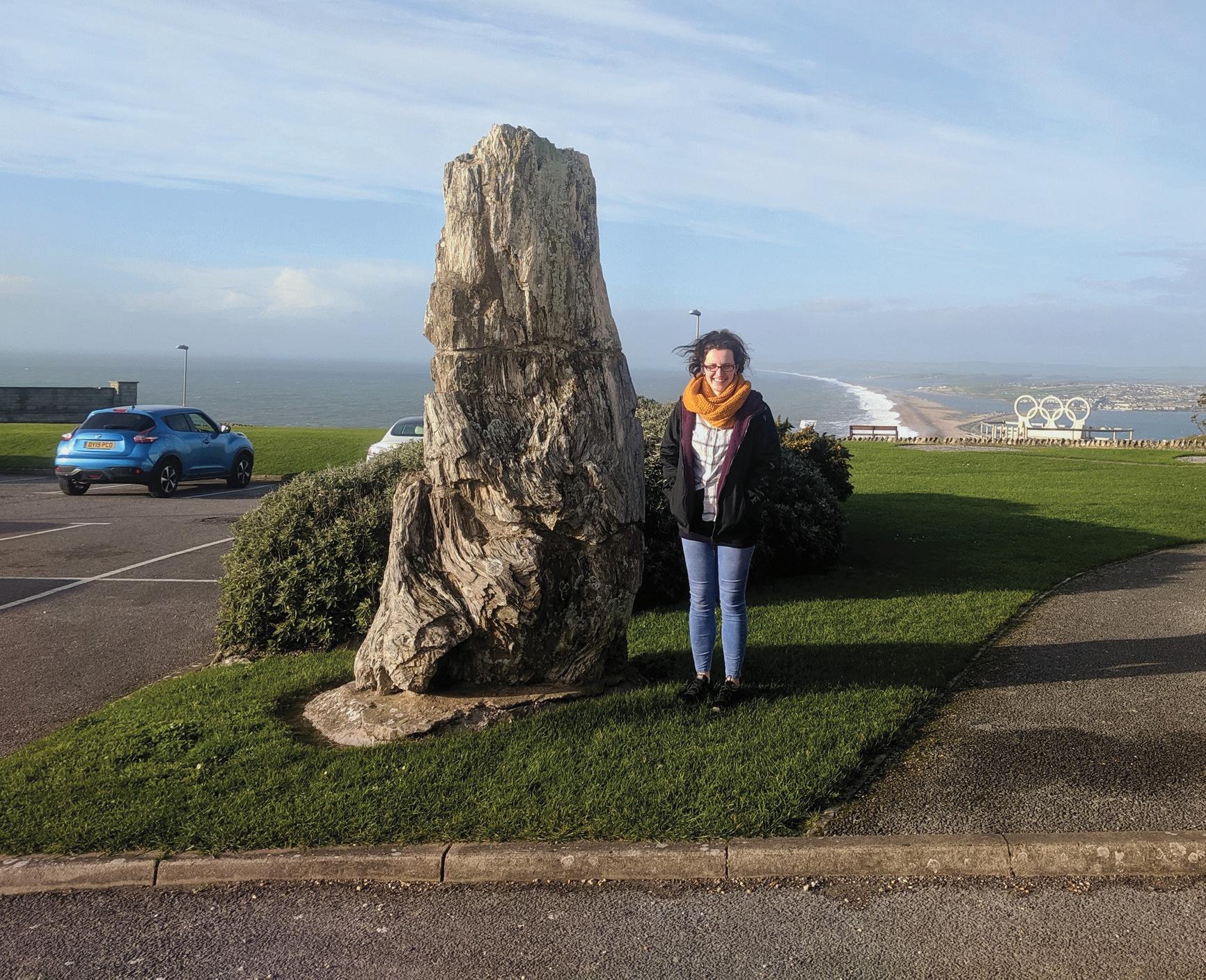 Figure 1.9 Fossil tree trunk from the basal Lulworth Formation of the Purbeck Group at the Portland Heights. Amy Beasley (nee Goudie), for scale (ASG).