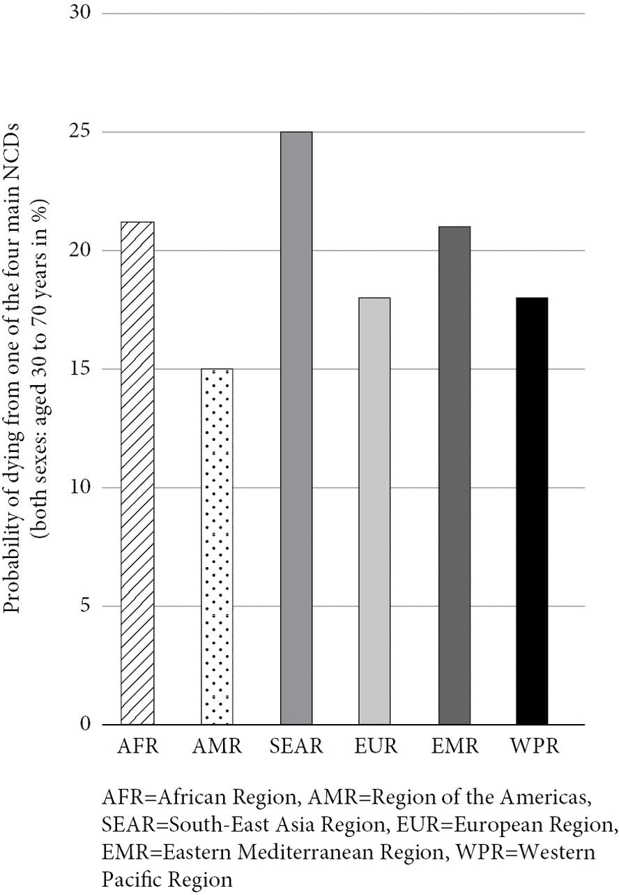 Approximately 36% (15 million) of all NCD deaths were in people under 70 years, and 85% occurred in low- and middle-income countries (WHO, 2014a; 2018a). People living in poverty are disproportionately affected by NCDs. For example, the probability of dying from one of these diseases before the age of 70 years varies across regions (see Figure 1.6), from 25% in South-East Asia to 15% in the Americas. This probability also varies between countries, from over 30% in low- and middle-income countries to less than 10% in highincome countries.