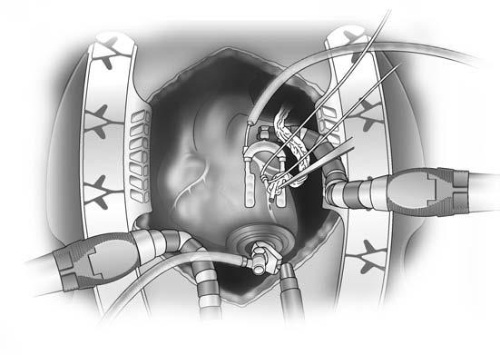 2.ConcernsabouttheadverseeffectsofCPBspurredthedevelopmentof “off-pump” coronarysurgery(OPCAB),duringwhichcompleterevascularizationshouldbe achievedwiththeavoidanceofCPB.Deeppericardialsuturesandvariousretraction devicesareusedtopositiontheheartforgraftingwithouthemodynamiccompromise. Astabilizingplatformminimizesmovementatthesiteofthearteriotomy (Figure1.4).Intracoronaryoraortocoronaryshuntingcanminimizeischemiaafter anarteriotomyisperformed.69