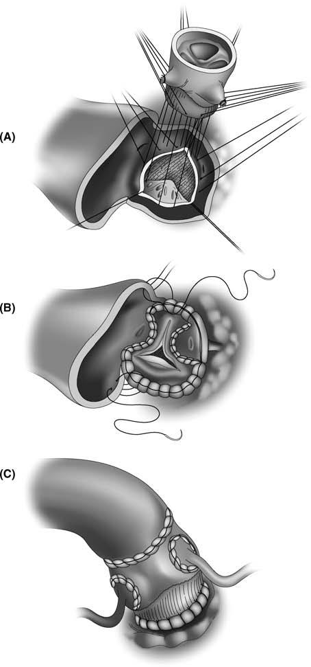 Figure1.9 . Stentlessvalveshavealargereffectiveorificethanstentedvalves,allowingformore regressionofLVhypertrophy.(A)TheproximalsuturelinesewsthelowerDacronskirtofthe prosthesistotheaorticannulus.(B)SubcoronaryimplantationofaMedtronicFreestylevalve. Thisrequiresscallopingoftwosinuseswiththedistalsuturelinecarriedoutbelowthecoronary ostia.(C)Astentlessvalvecanbeusedasarootreplacement,requiringreimplantationofbuttons ofthecoronaryostia.Thedistalsuturelineisanend-to-endanastomosistotheaorticwall.