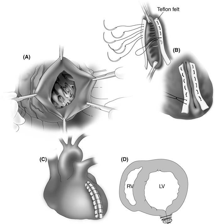 Figure1.5 . Repairofaleftventricularaneurysmusingthelinearclosuretechnique.(A)The thinned-outscartissueisopenedandpartiallyresected.Anyleftventricularthrombusisremoved. (B)Theaneurysmisthenclosedwithmattresssuturesoverfeltstrips.(C)Anadditionalover-andoversutureisplacedoverathirdfeltstrip.(D)Cross-sectionofthefinalrepair.