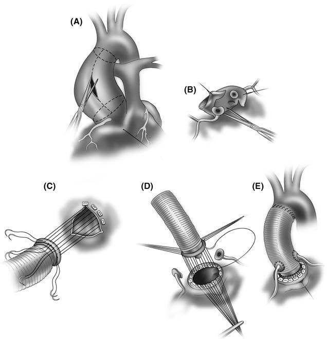 Figure1.11 . Bentallprocedure.(A)Theaortaisopenedlongitudinallyandthendivided proximallyanddistally.(B)Coronaryostialbuttonsaremobilized.(C,D)Avalveincorporatedinto theproximalendoftheconduitisthensewntotheaorticannulus.(E)Thecoronaryostialbuttons arereimplantedandthedistalsuturelineiscompleted.