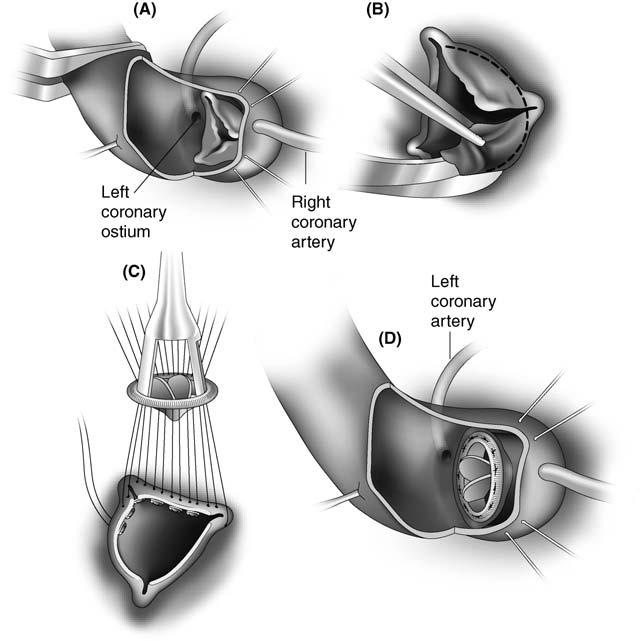 Figure1.8 . Aorticvalvereplacement.(A)Atransverseaortotomyincisionismadeandholding suturesareplaced.(B)Thevalveisexcised,andtheannulusisdebridedandsized.(C,D) Pledgetedmattresssuturesareplacedthroughtheannulusandthroughthesewingringofthe valve,whichistiedintoposition.Theaortotomyisthenclosed.