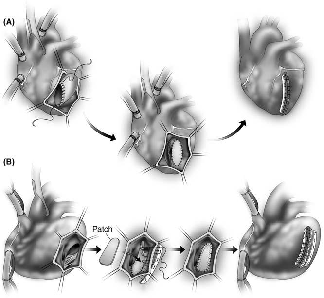 exclusionofthenoncontractingsegmentwithapatch.Thisproducesanelliptical contouroftheheartandresultsinsignificantimprovementinventricularsizeand function.Thisprocedureisgenerallydoneonabeatinghearttoallowforbetter differentiationofakineticandnormalsegmentsoftheheart.