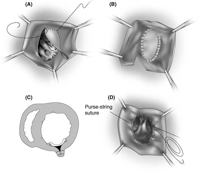 Figure1.6 . Repairofaleftventricularaneurysmusingtheendoaneurysmorrhaphytechnique. (A,B)Apericardialpatchissewnatthebaseofthedefectatthejunctionofscarandnormal myocardiumtobetterpreserveventriculargeometry.Theresectededgesoftheleftventricleare closedinasimilarfashiontothelineartechnique.(C)Cross-sectionofthefinalrepair.(D)TheDor procedureisamodificationofthistechniqueinwhichacircumferentialpursestringsutureis placedatthebaseofthedefecttorestoreanormalorientationtotheventricle.Apatchisthen sewnoverthedefect.