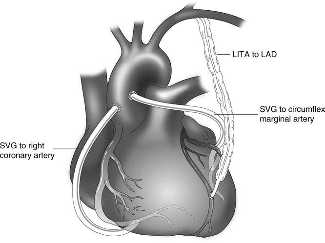 Figure1.3 . Coronaryarterybypassgrafting.Aleftinternalthoracicartery(LITA)hasbeen placedtotheleftanteriordescendingartery(LAD)withaortocoronarysaphenousveingrafts (SVG)tothecircumflexmarginalandrightcoronaryarteries.
