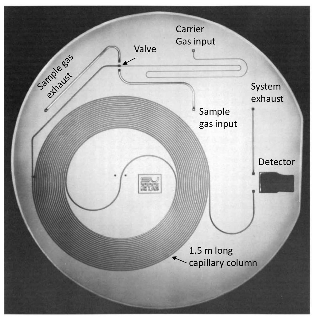 1.11: Firstmicrofluidicsystem(1975)[28]:aminiaturized gaschromatographer,including aninjector,a1.5mlongmicrochannelandathermaldetector.(ReprintedwiththepermissionofIEEE,copyright2022.)