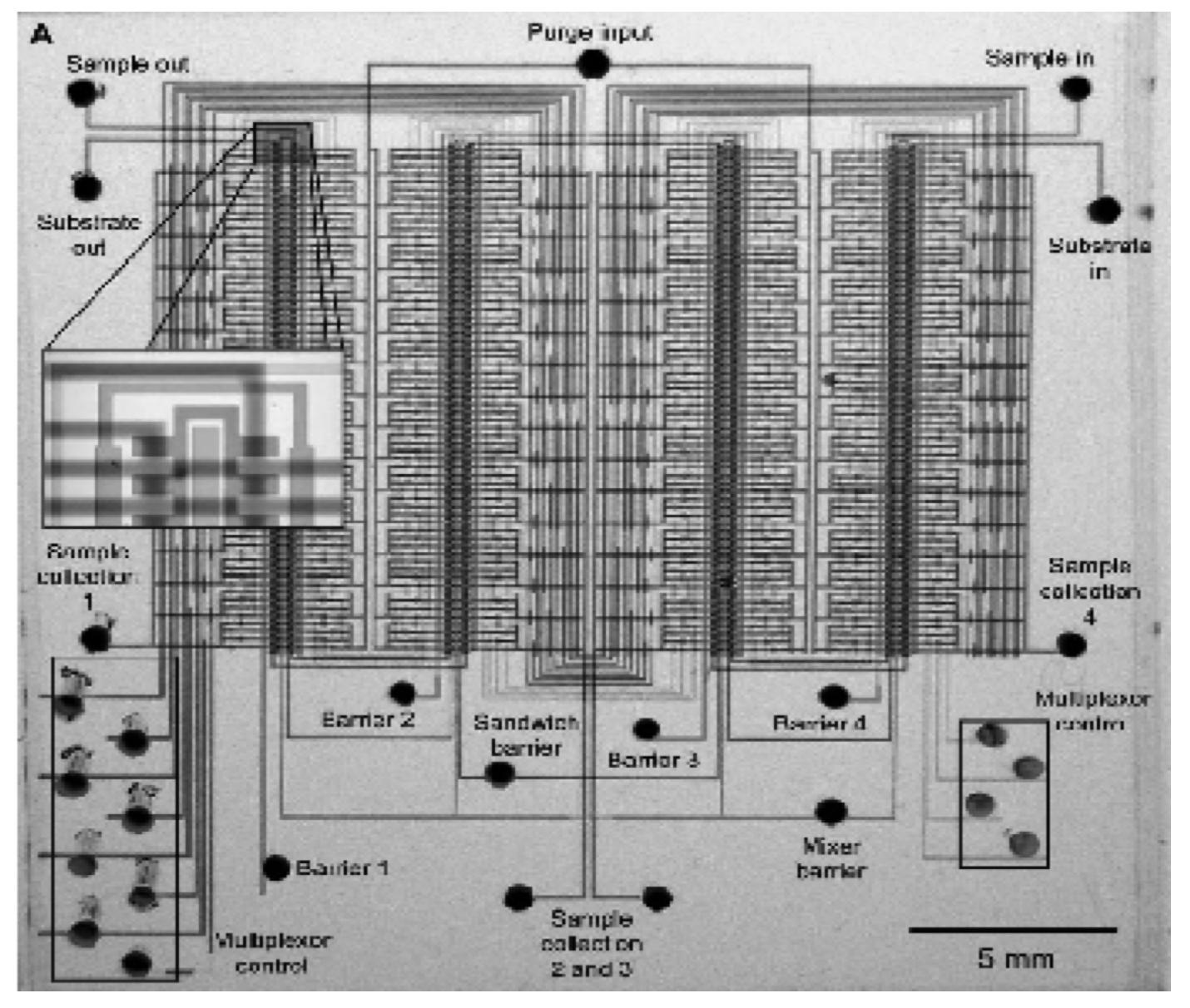 Inthiscontext,asurgeofinnovationsemerged.Onelandmarkwasthedemonstration, in2002,that,byexploitingthedeformabilityofPDMS[77],thousandsofvalvescould beintegratedonthesamedevice[78].ThisisshowninFig.1.16.Thevalveproblem, raisedinthepreviousdecade,seemedtobesolved.Thetechnologygavebirthtoa company,Fluidigm,whosevaluationwouldsoonreachUS$1bn.WithCepheidand Fluidigm,twomicrofluidicunicornswerebornintheyears2000-2010.19