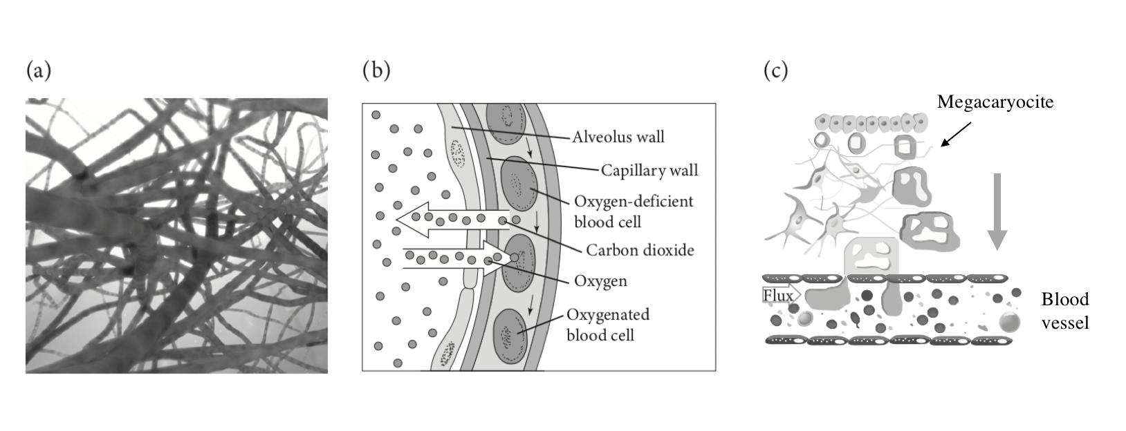 Fig.1.3: (A)Representationofanetworkofbloodvessels.Gasesandnutrientsareexchanged betweenthebloodandsurroundingtissuethroughthepermeablewallsofcapillaries,the smallestbloodvessels(fromDesigncell,2013).(B)Sketchofthegastransferstakingplace inthelungs.(C)Migrationofamegakaryocyteinthebonetissue,penetrationintheblood vessel,andthesubsequentplateletformation.