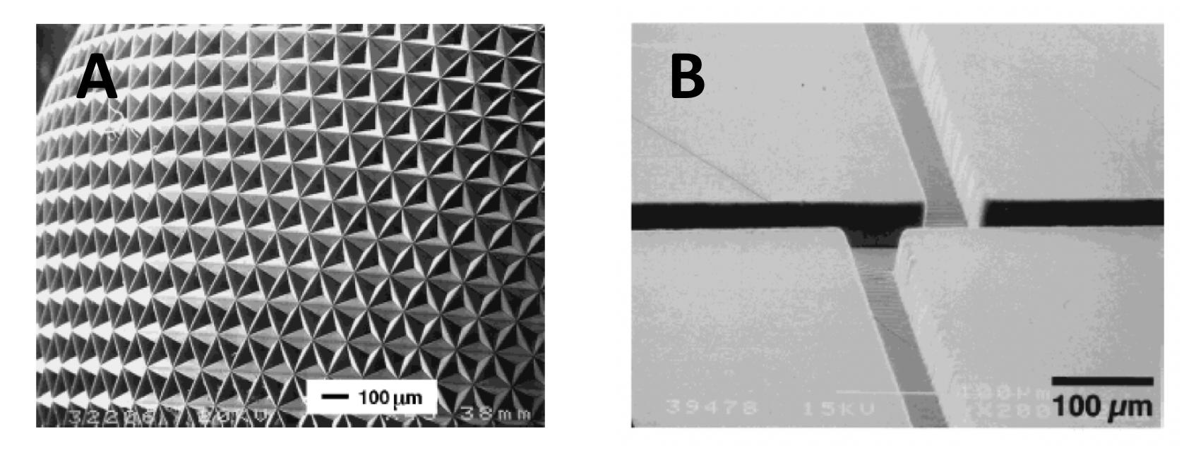 Fig.1.15: (A)ScanningelectronmicrographsofaPDMShoneycombstructure,createdby moldingthepolymeragainstaphotoresistmould(ReprintedfromRef.[69]withpermission fromWileyandSons,copyright2022WileyandSons).(B)Double-Tsectionofthenetworkof channels.TheroughnessinthesidewallsofthePDMSchannelsarisesfromthelimitedmask resolution(ReprintedwithpermissionfromRef.[70],copyright2022AmericanChemical Society.).