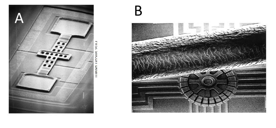 Fig.1.8: (A)Firstmicrobeam(1982).(B)Firstmicromotor,madeatUCBerkeleybyTai andMullerin1989.Thismotorhasbeenplacednexttoahumanhairwhosediameterison theorderof200 µm.(CourtesyofProfessorRichardS.Muller,BerkeleySensor&Actuator Center,UniversityofCalifornia,Berkeley).