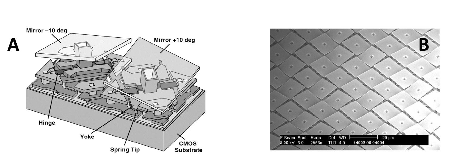 Fig.1.9: (A)OpticalMEMS(MOEMS)madebyTexasInstrument,usedindigitalprojectors. (B)Anarrayofmicro-mirrorsusedinavideo-projector.Thesizeofeachmirroris10 µm [24](CreativeCommonsAttribution4.0UnportedLicense).